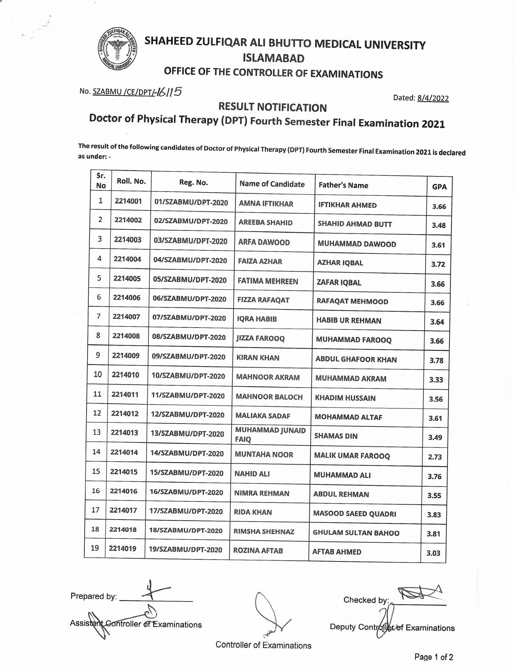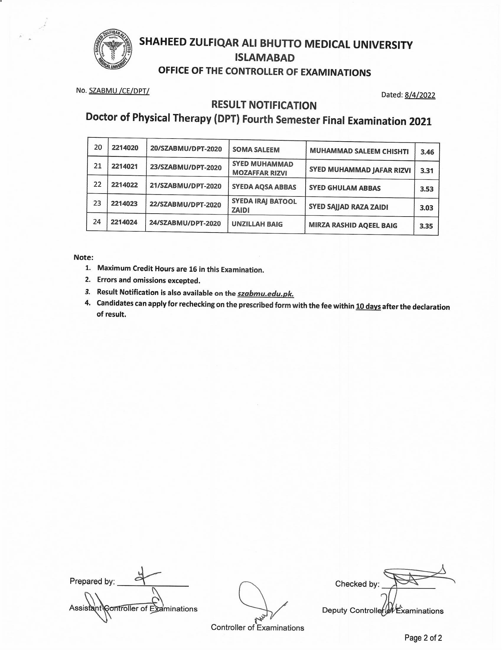 Result Notification - DPT Fourth Semester Final Examination 2021