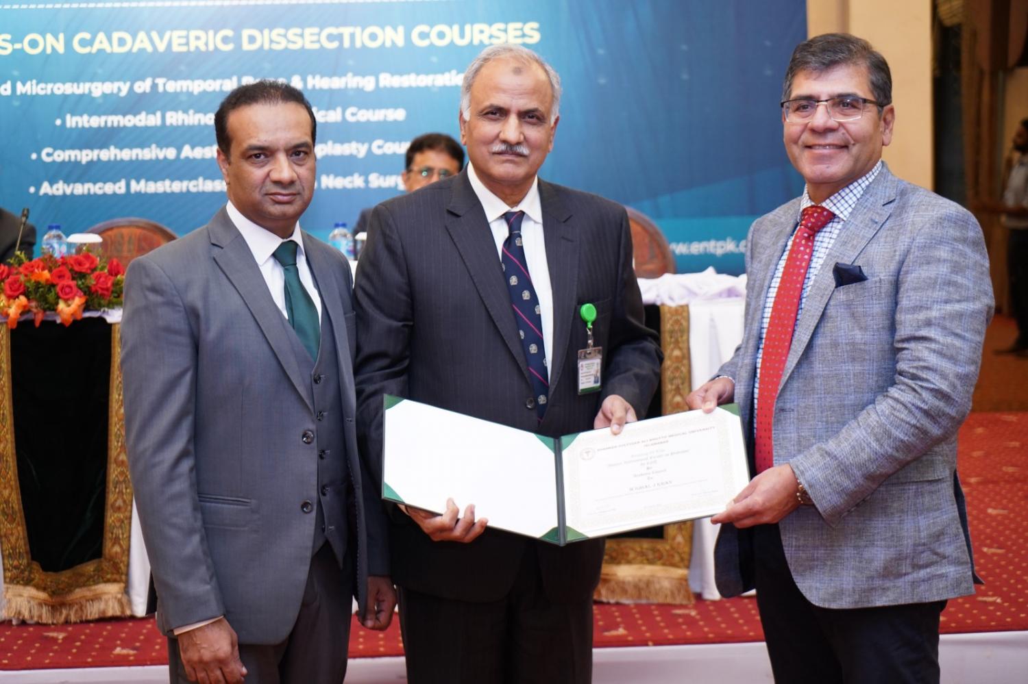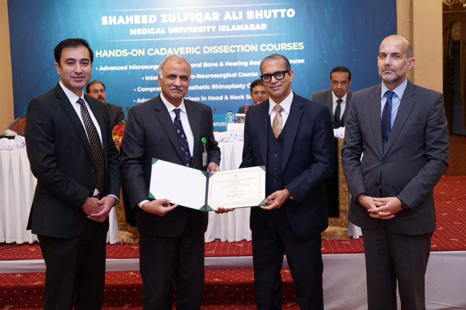 The honours were presented by Prof. Dr. Tanwir Khaliq, Vice Chancellor of SZABMU and a renowned national surgeon, during the inaugural ceremony of the 7th Islamabad ENT Hands-on Cadaver Dissection Course held at a local hotel in Islamabad.