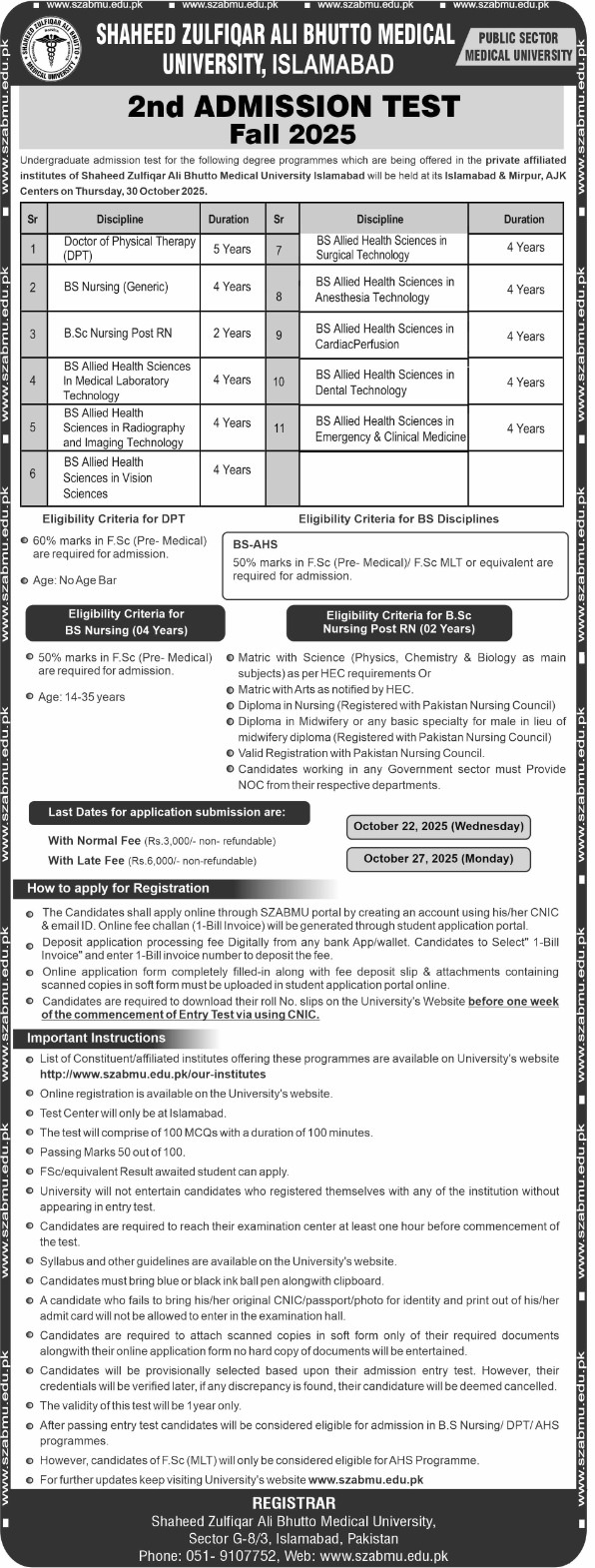 Undergraduate Entry Test of BS Allied Health Sciences (AHS), DPT & Nursing Admission Fall 2025 for Private institutes of SZABMU