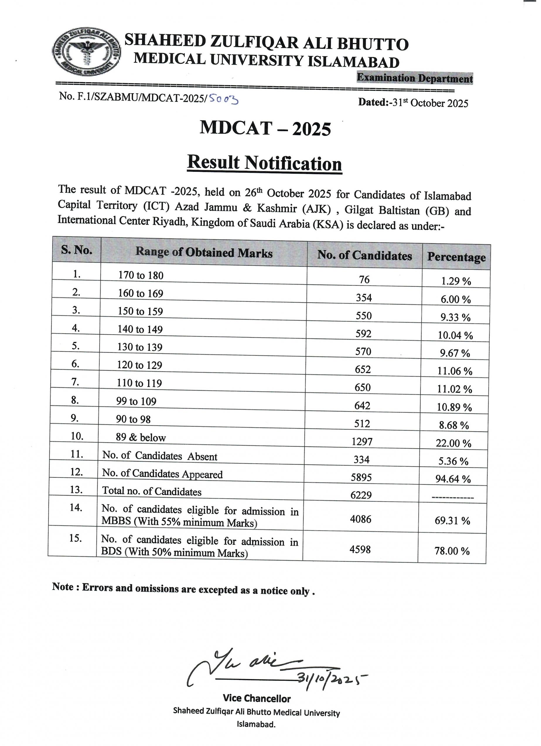 Result Notification - Medical & Dental College Admission Test (MDCAT) 2025 held on 26 October 2025