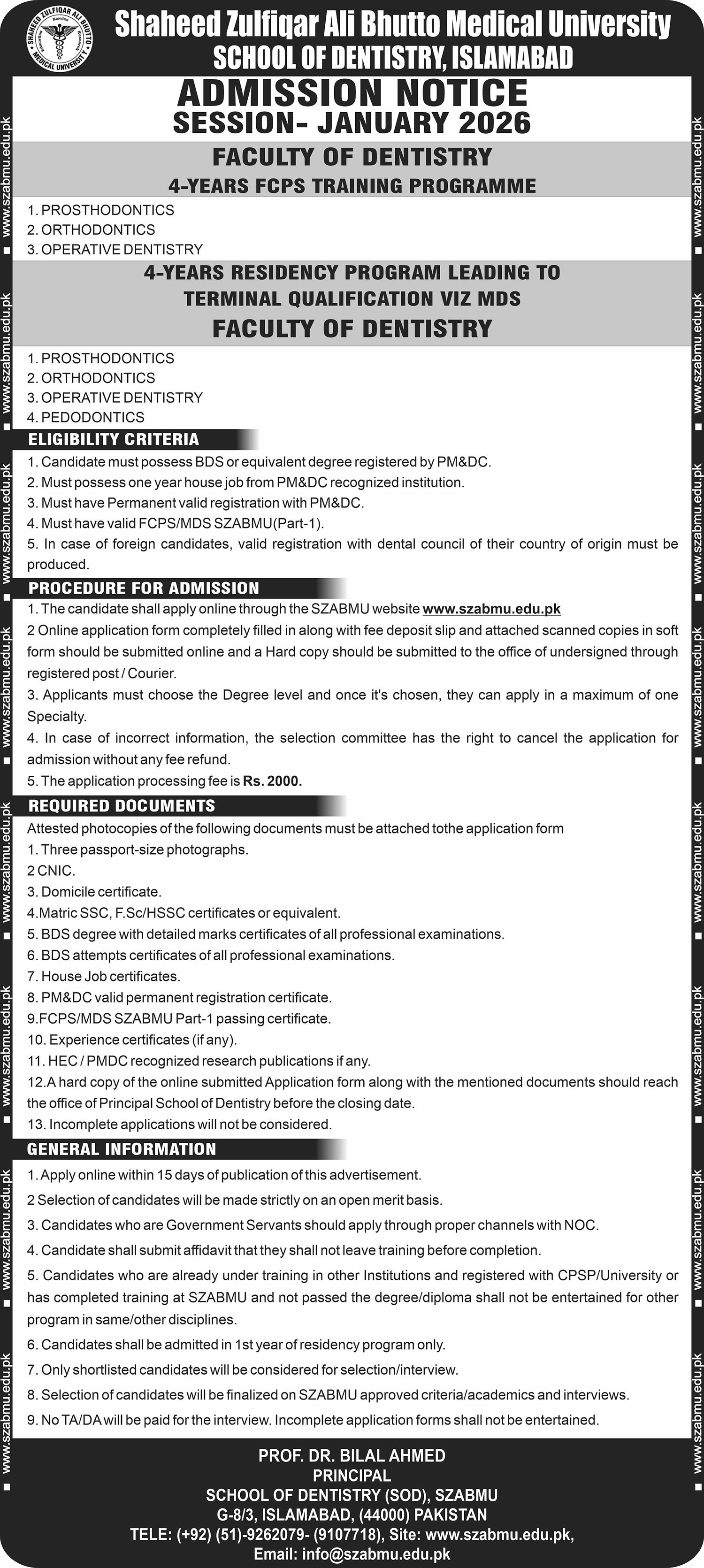 Admission Notice Session January 2026 - MDS & FCPS Dentistry