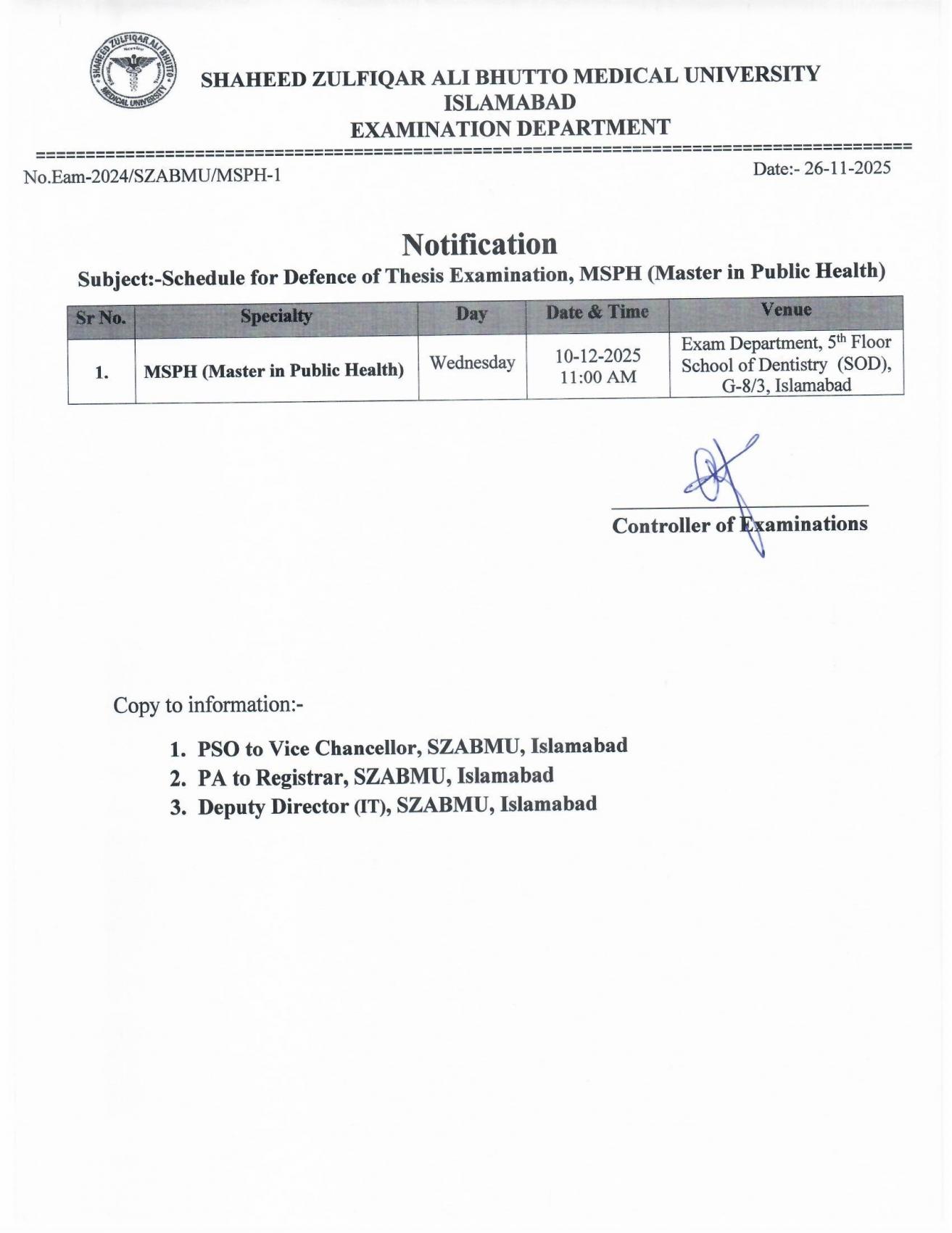 Schedule for Defense of Thesis Examination, MSPH (Master in Public Health)
