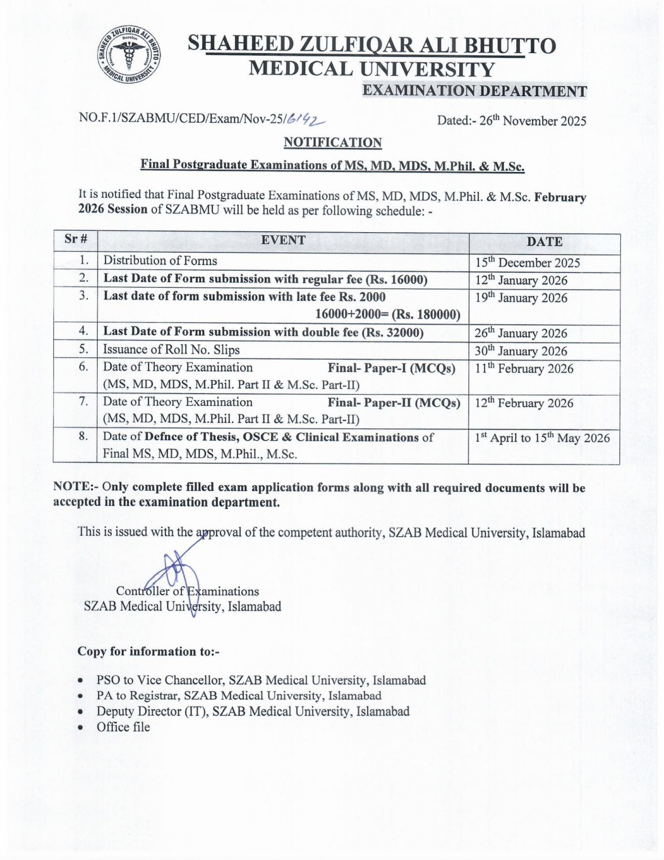 Notification Final Postgraduate Exam of MS, MD, MDS, M.Phil. & MSc February session 2026
