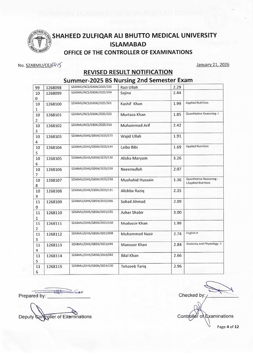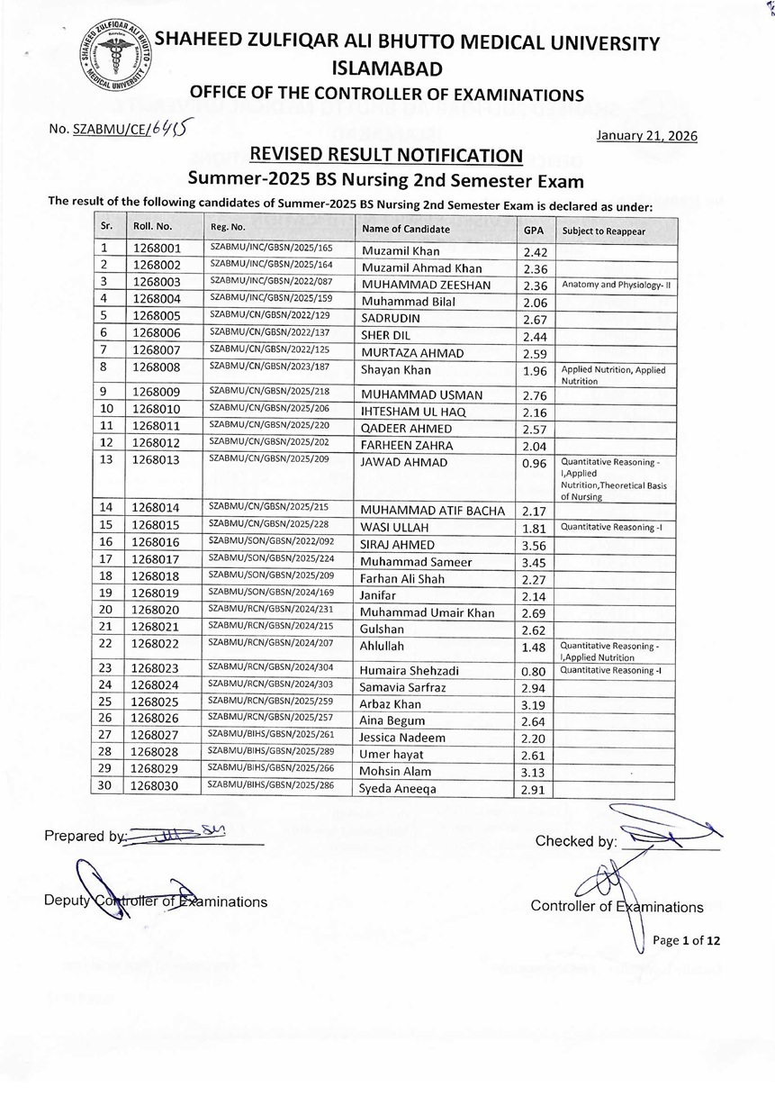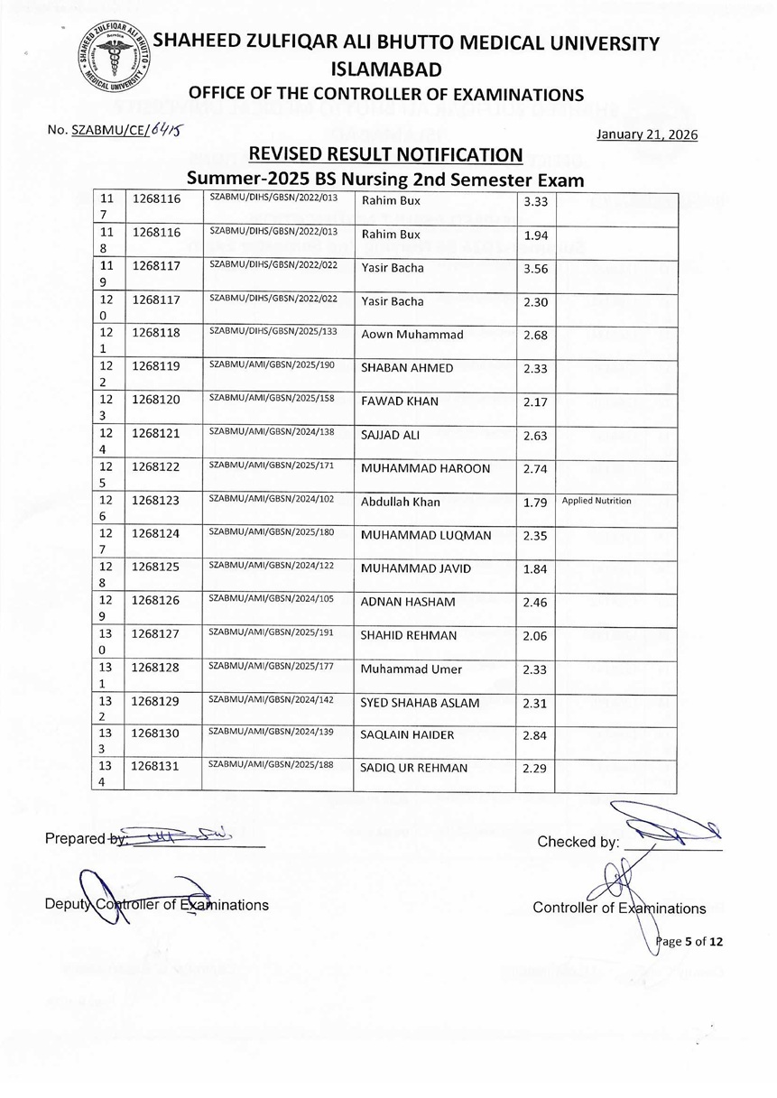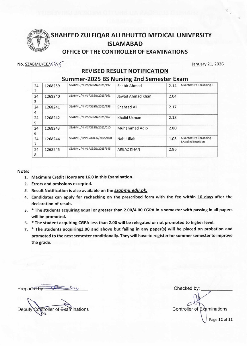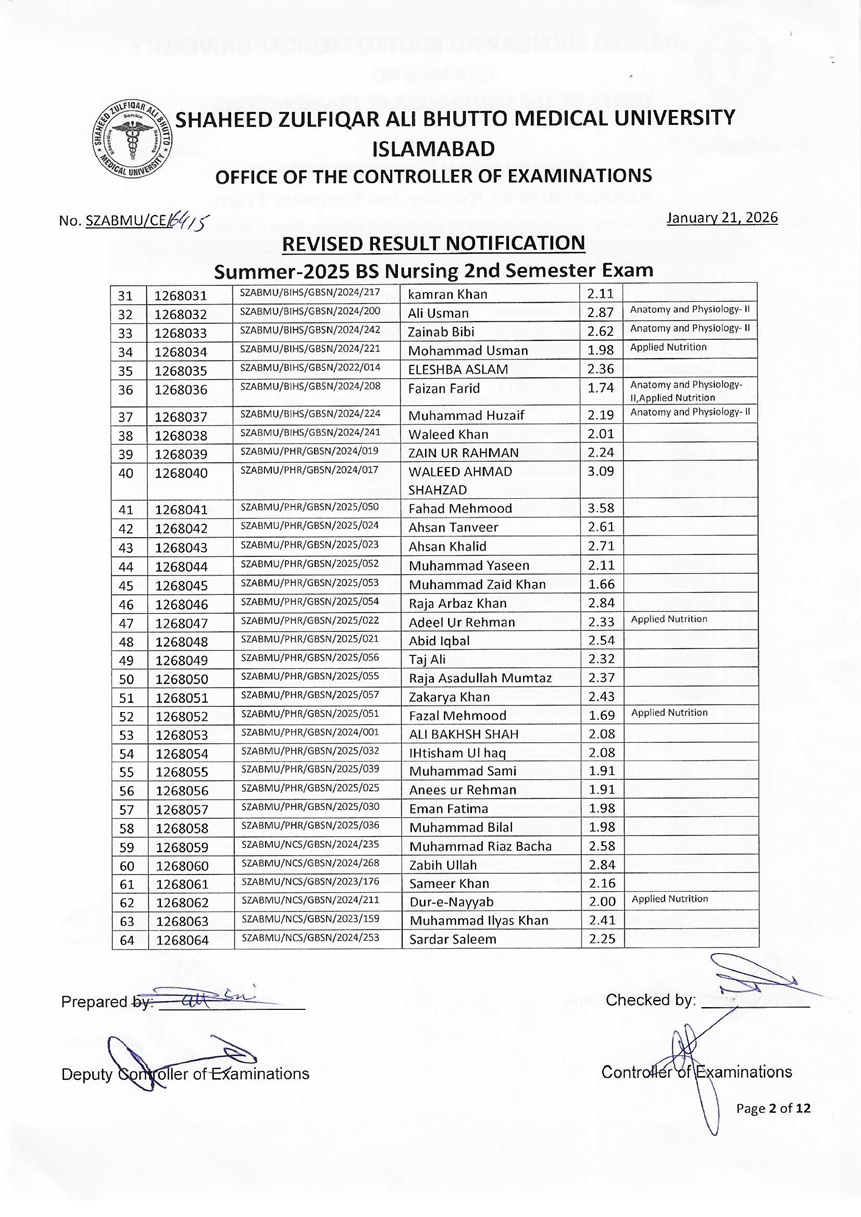 Revised Result Notification - Summer 2025 BS Nursing 2nd Semester Exam