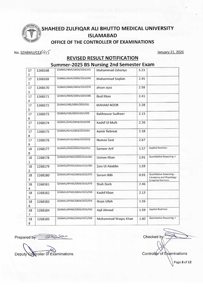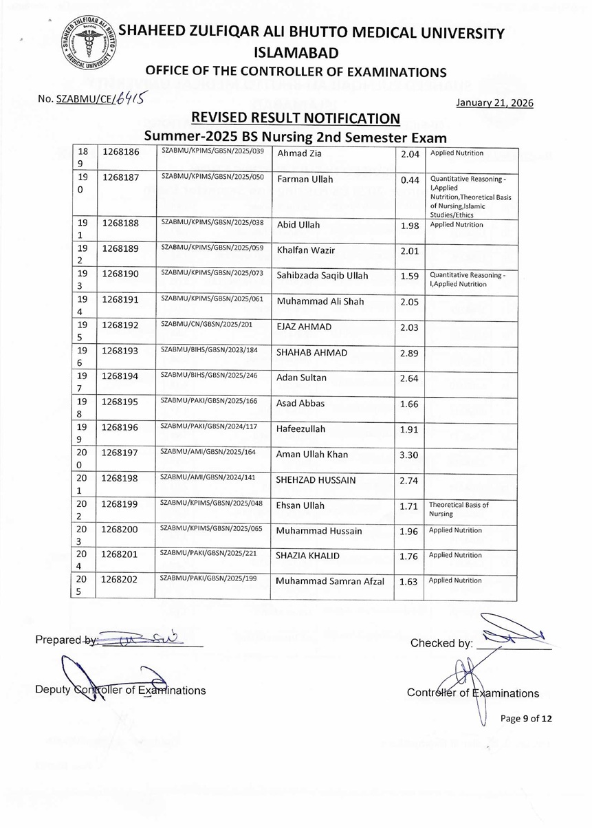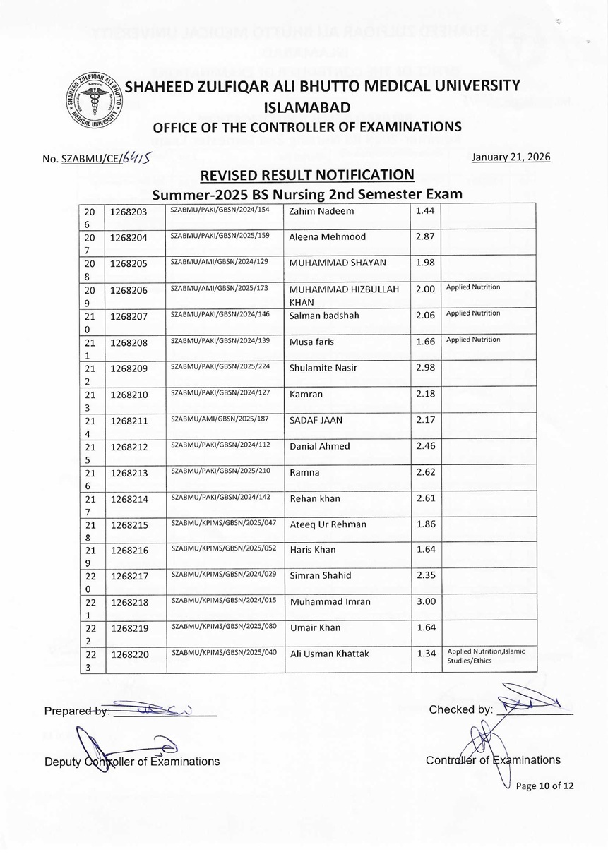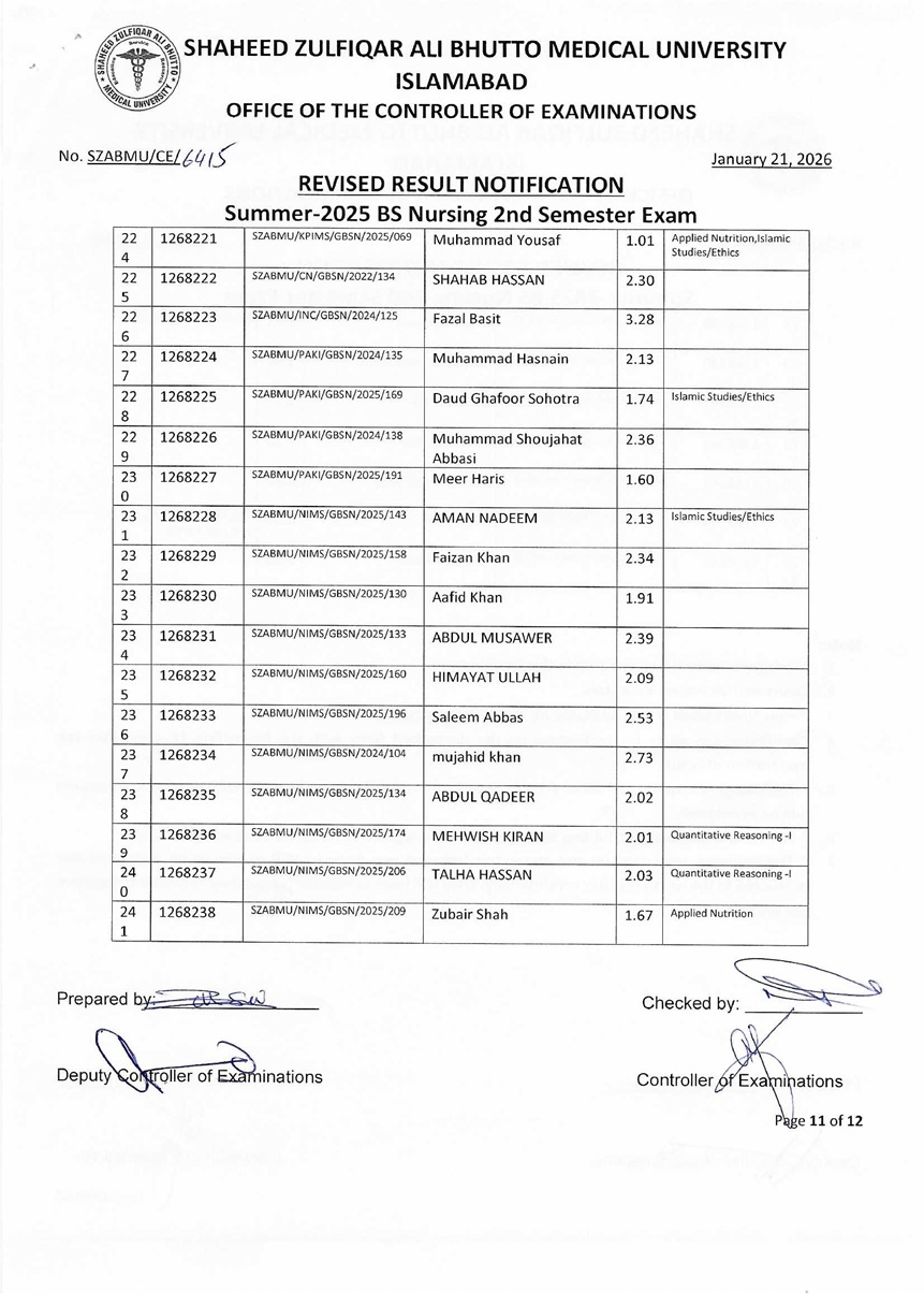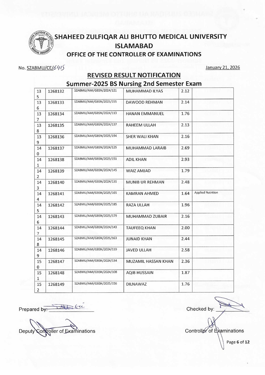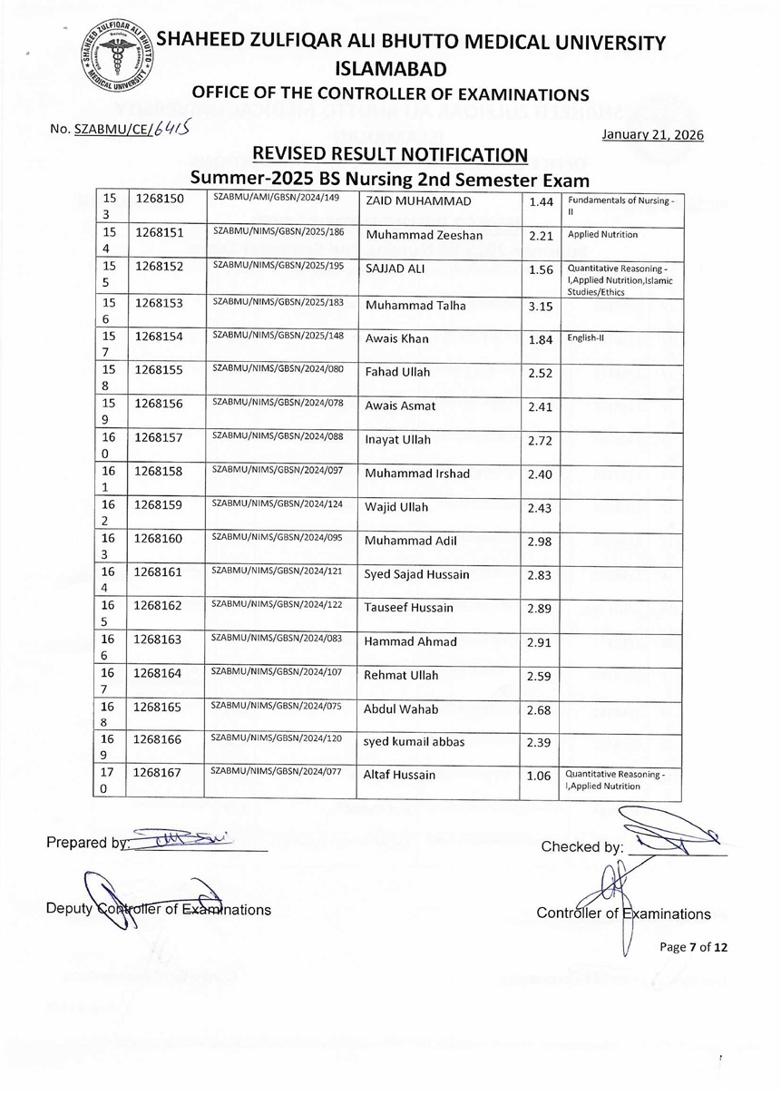Revised Result Notification - Summer 2025 BS Nursing 2nd Semester Exam
