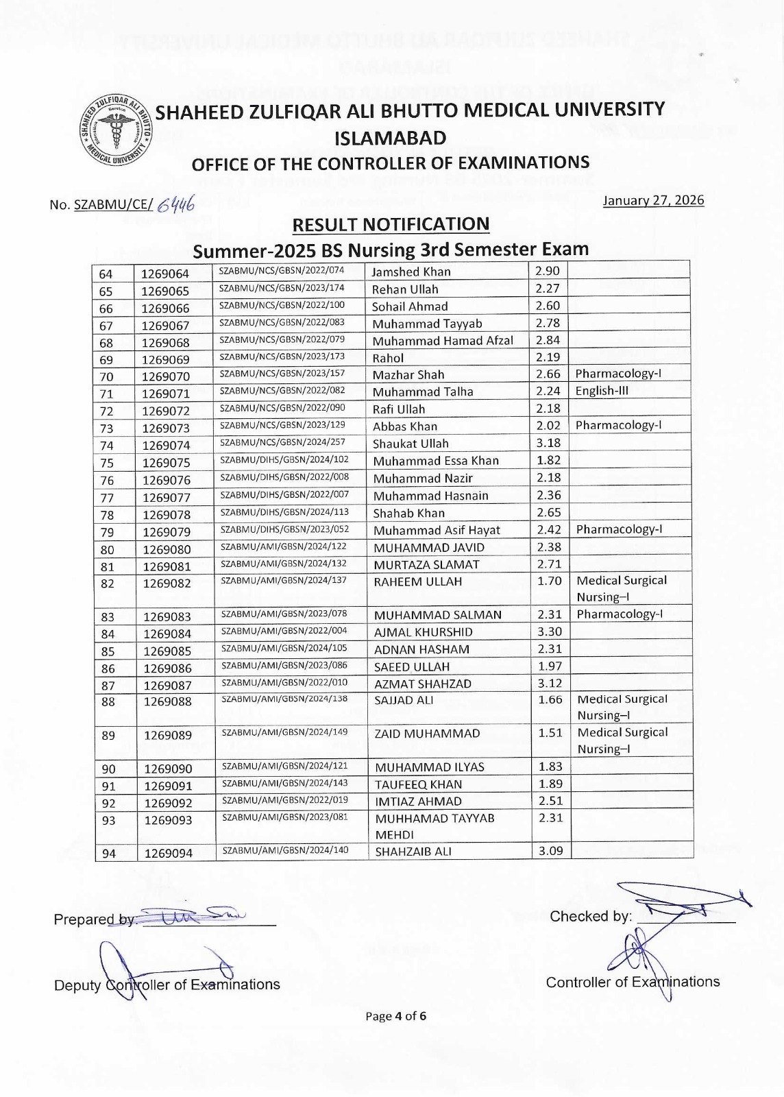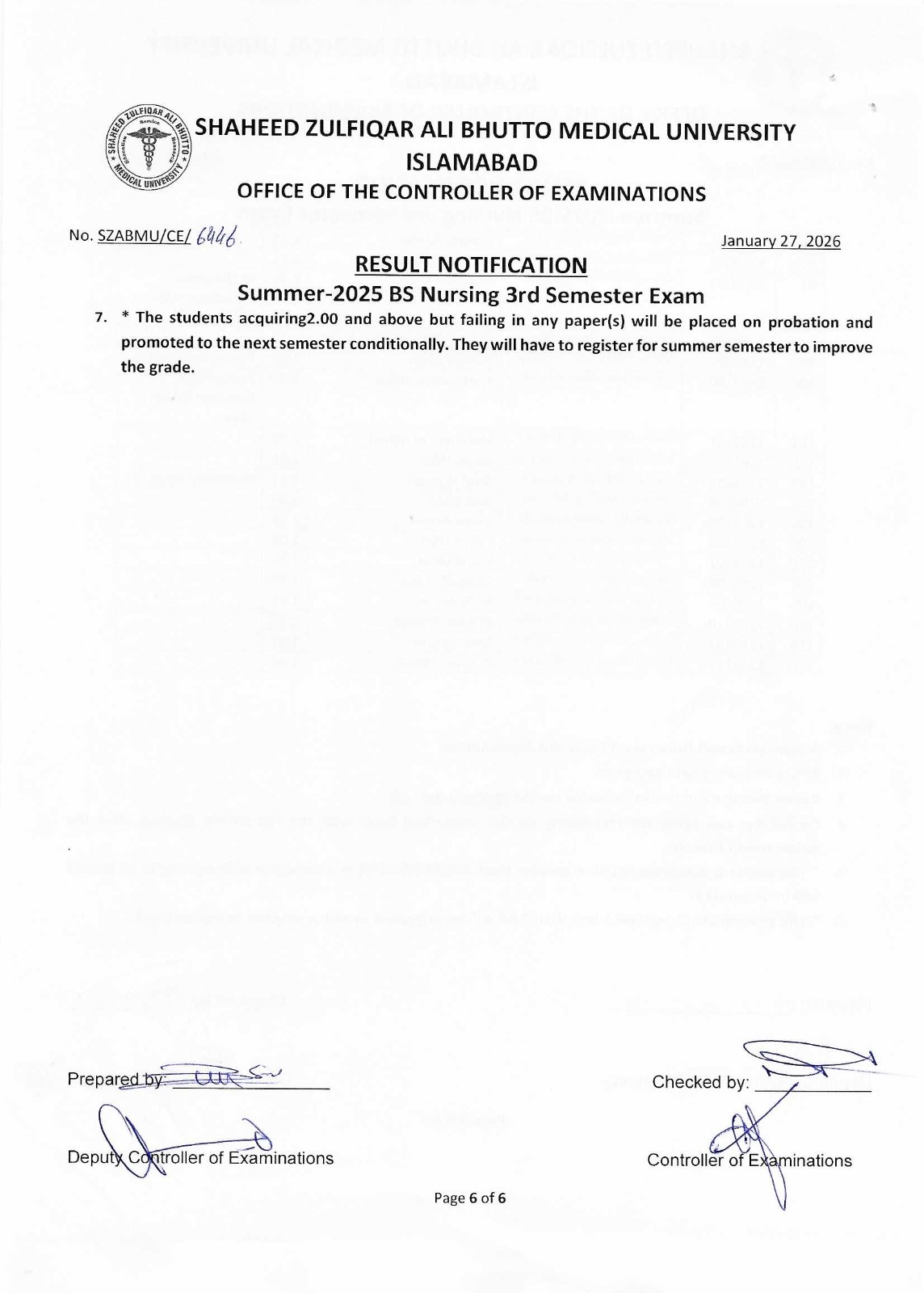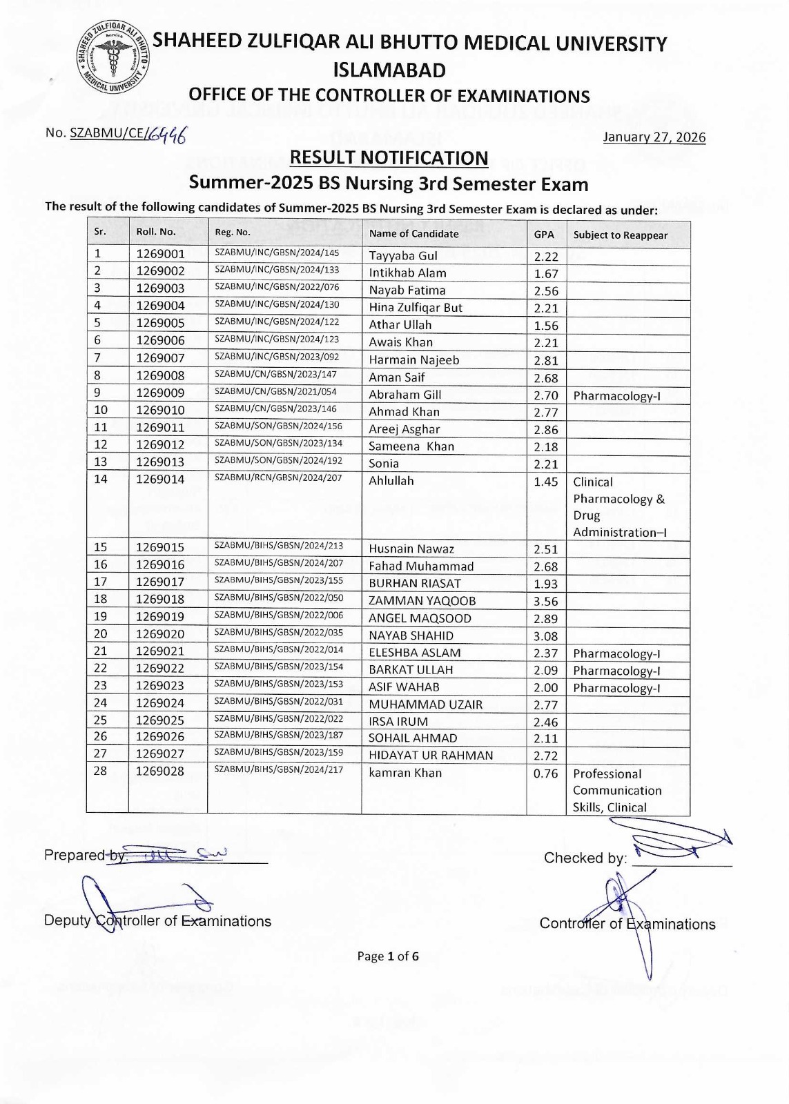Result Notification - Summer 2025 BS Nursing 3rd Semester Exam