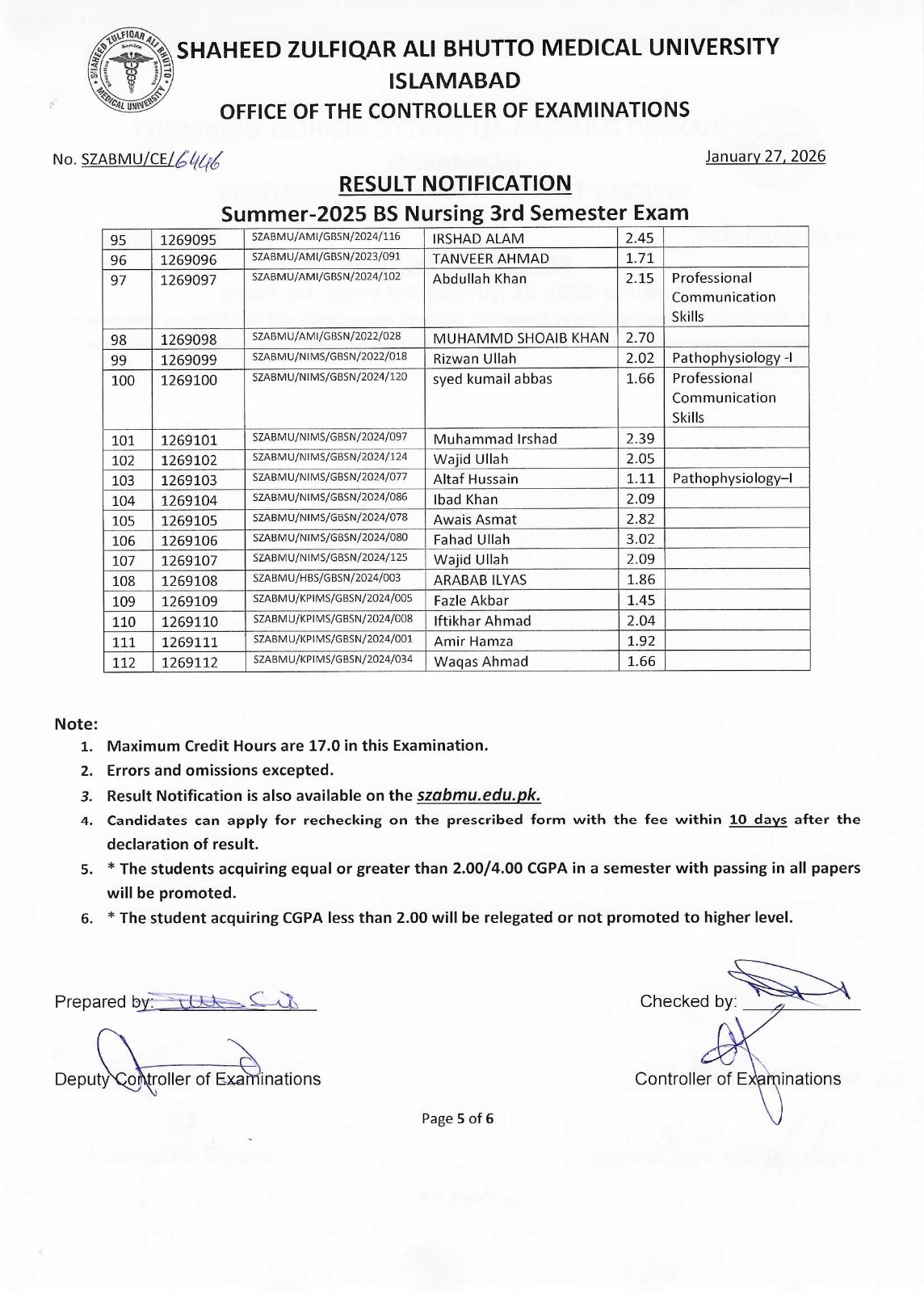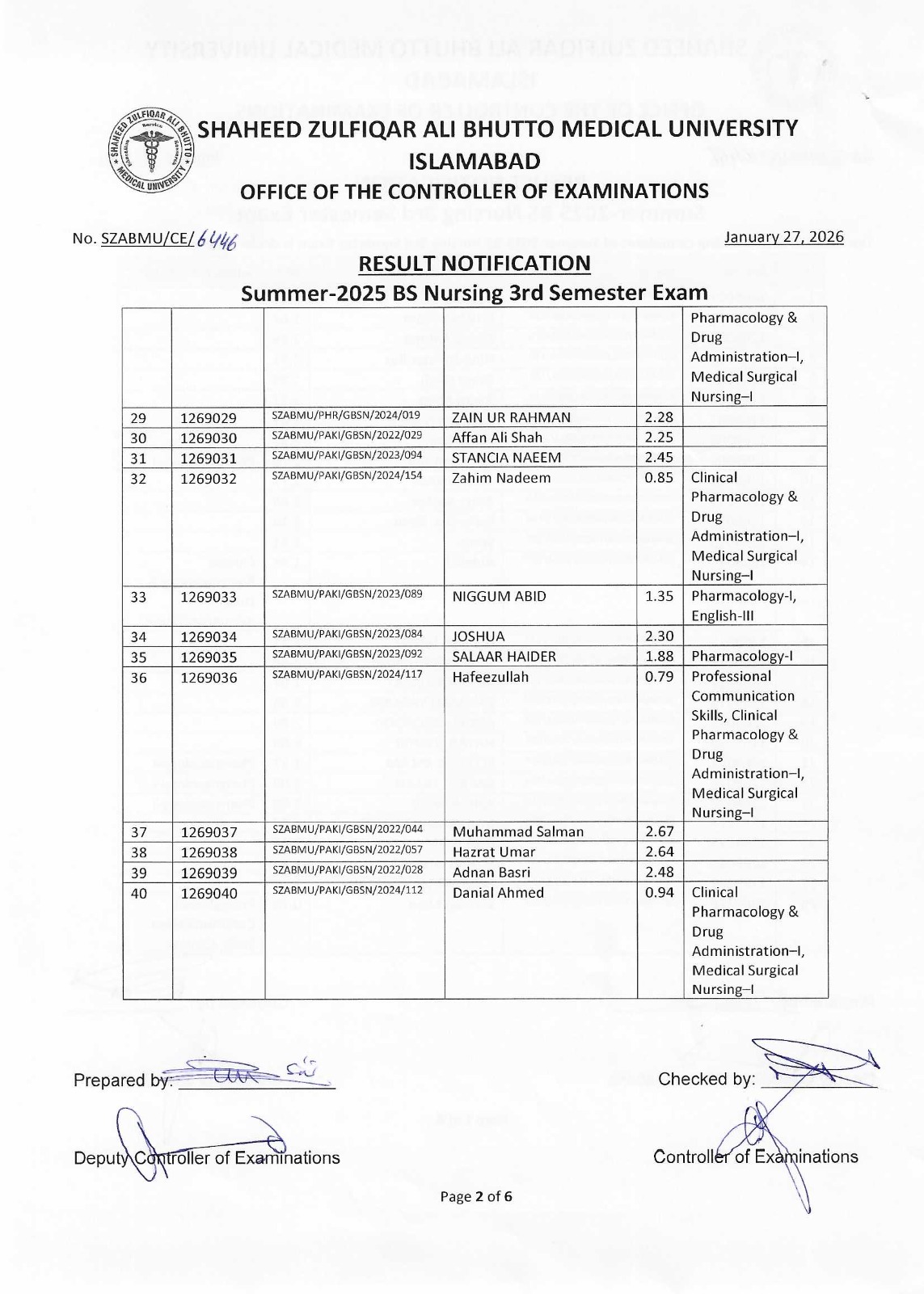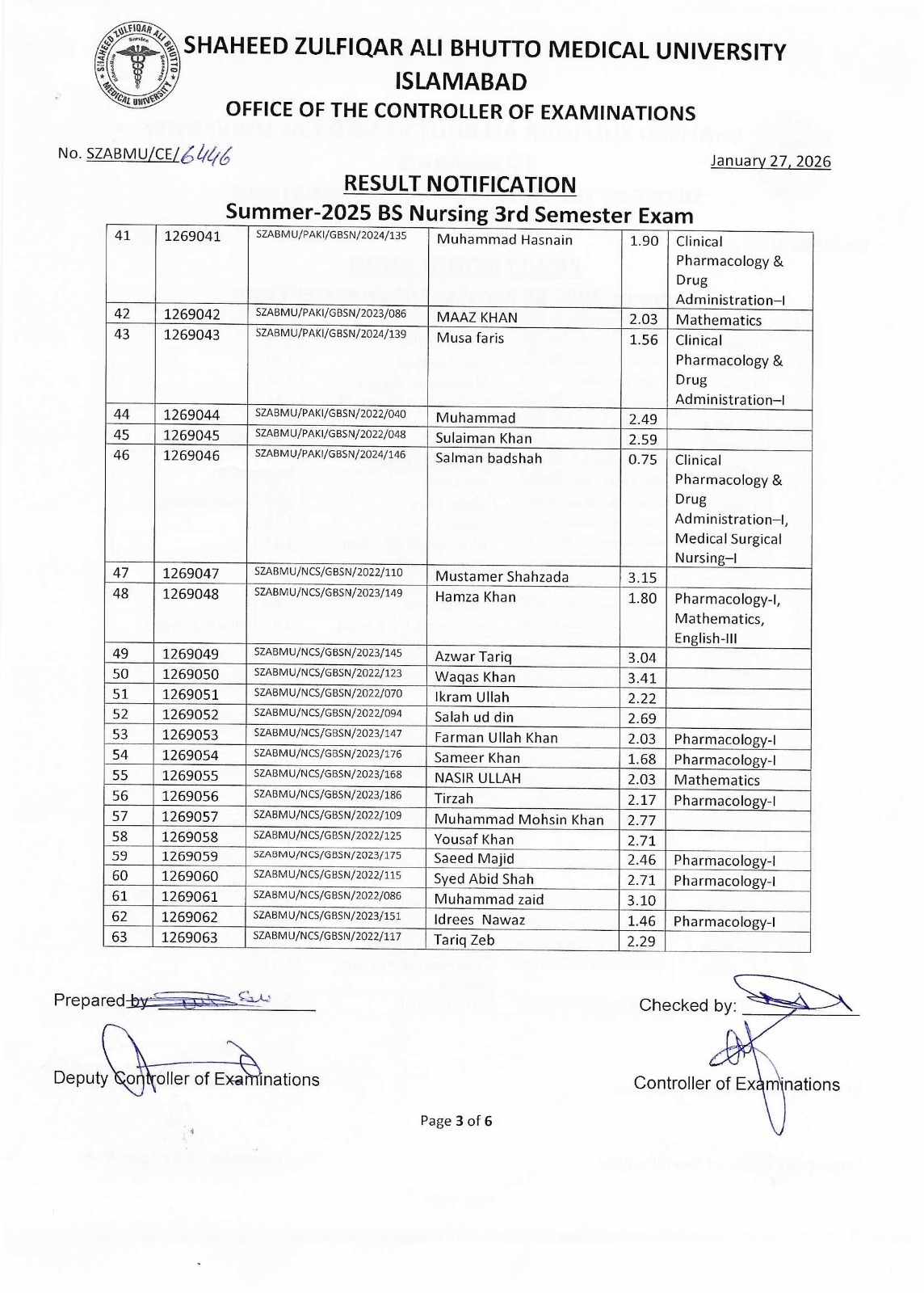 Result Notification - Summer 2025 BS Nursing 3rd Semester Exam