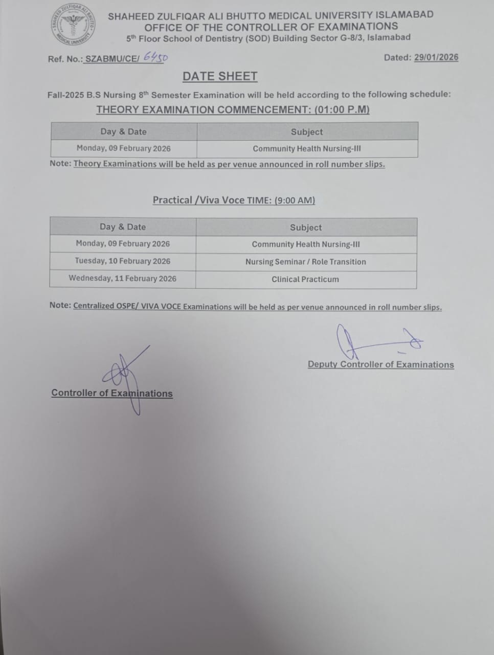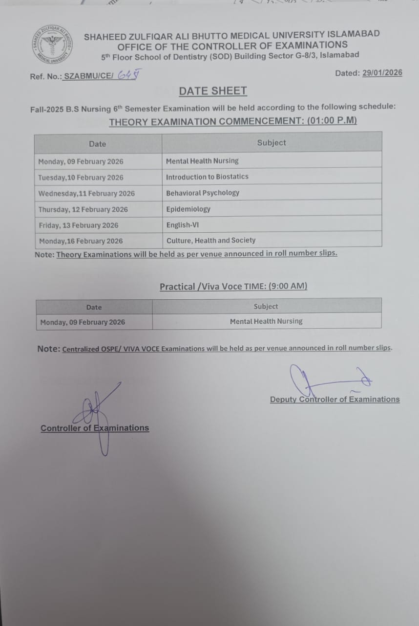 Date Sheet - Fall 2025 BS Nursing Exams