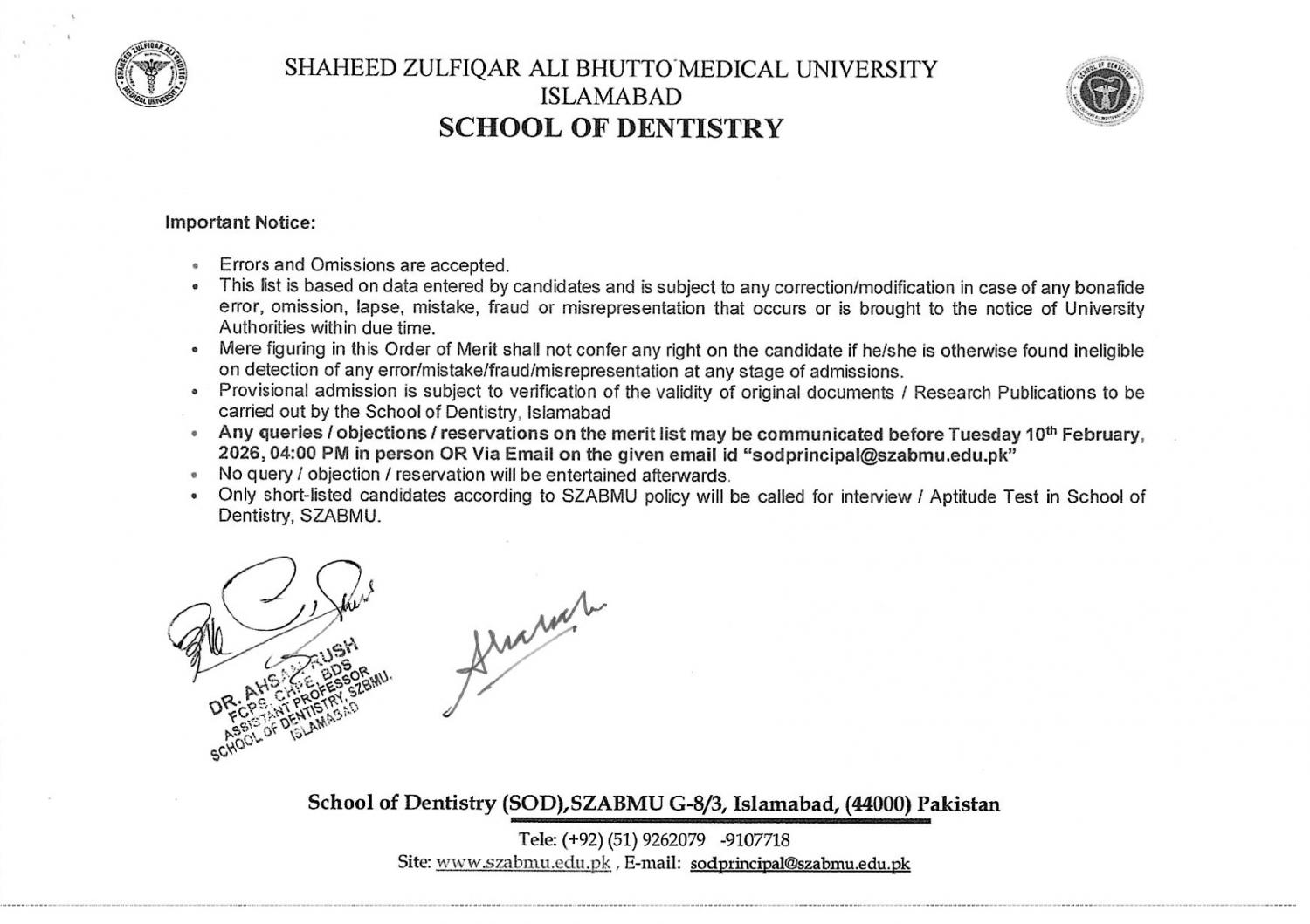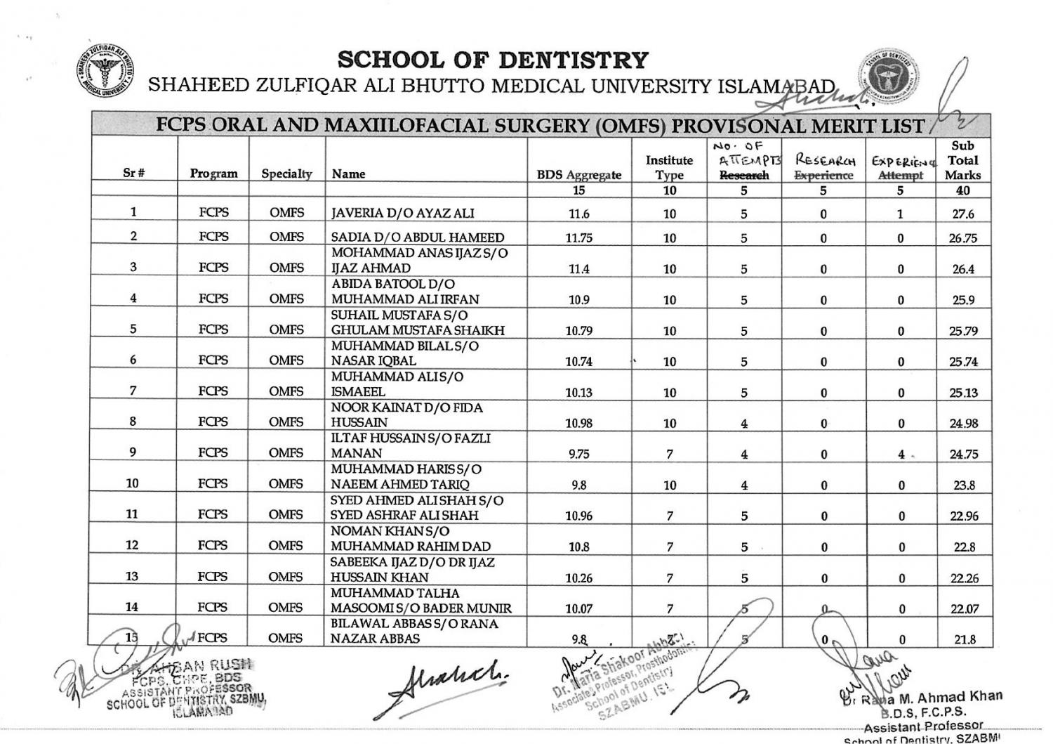 Provisional Merit List for OMFS Postgraduate induction FCPS and MDS, Session 2026