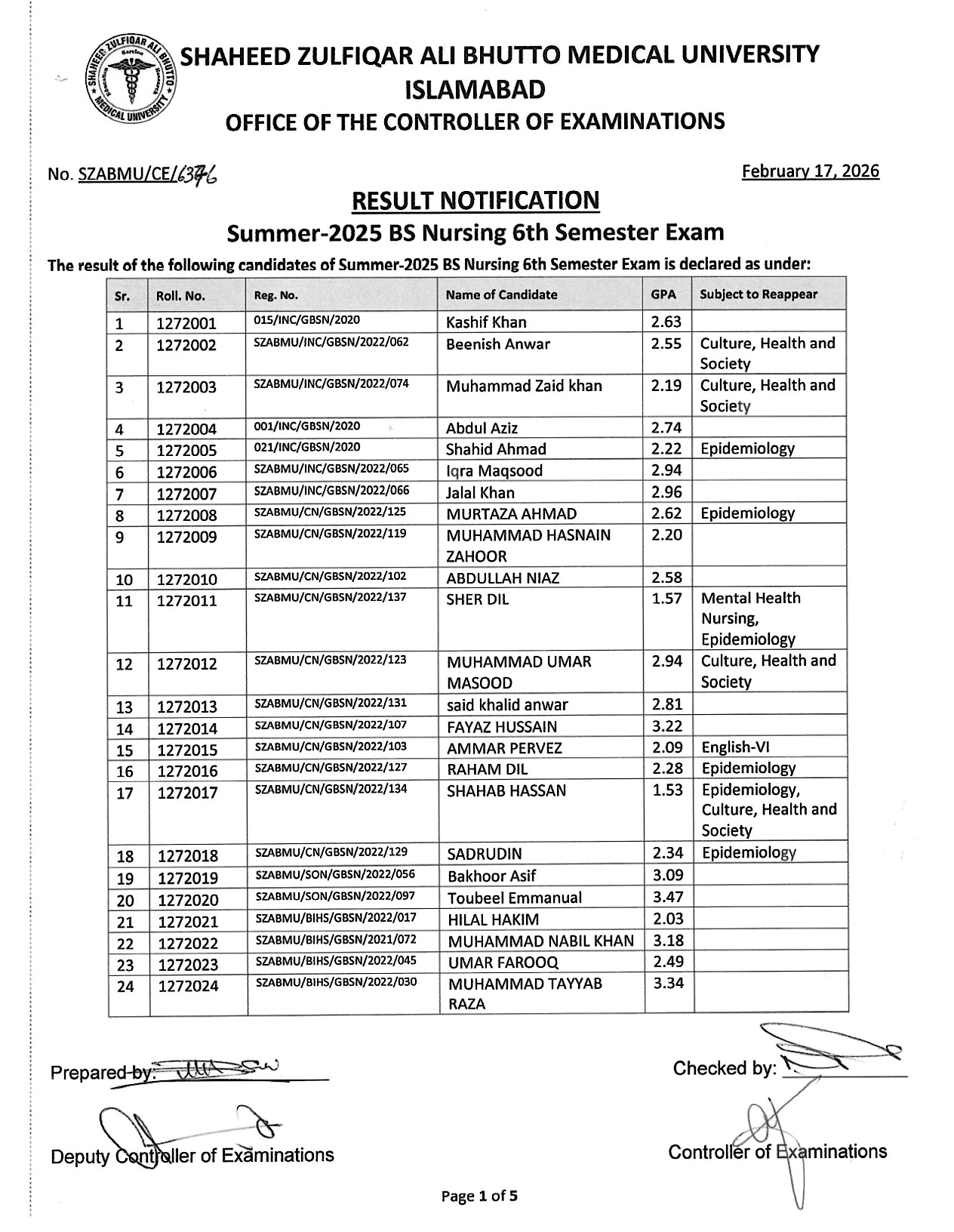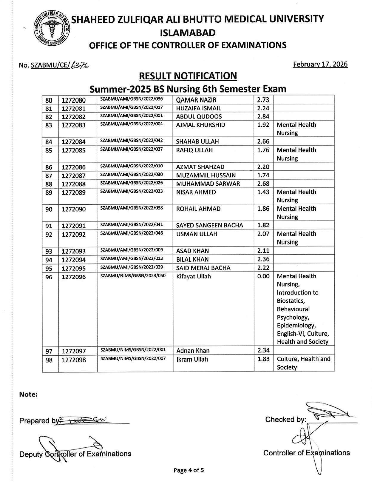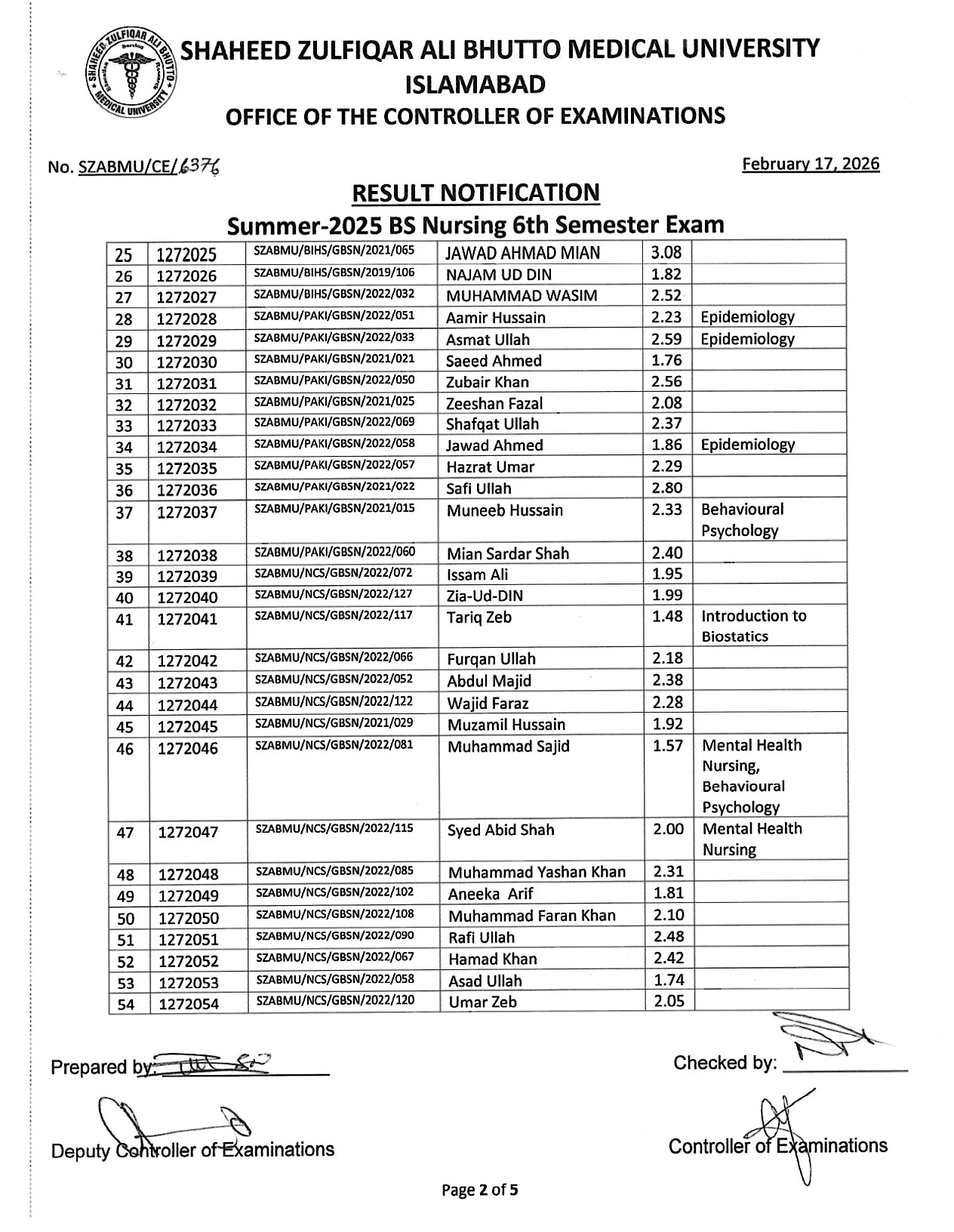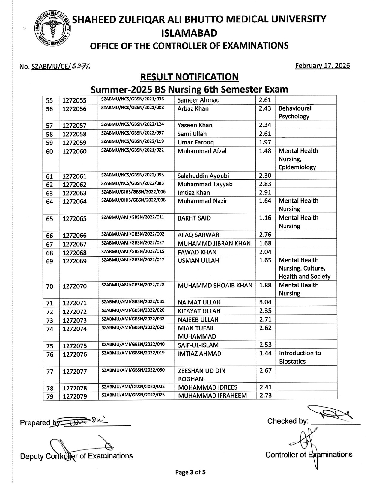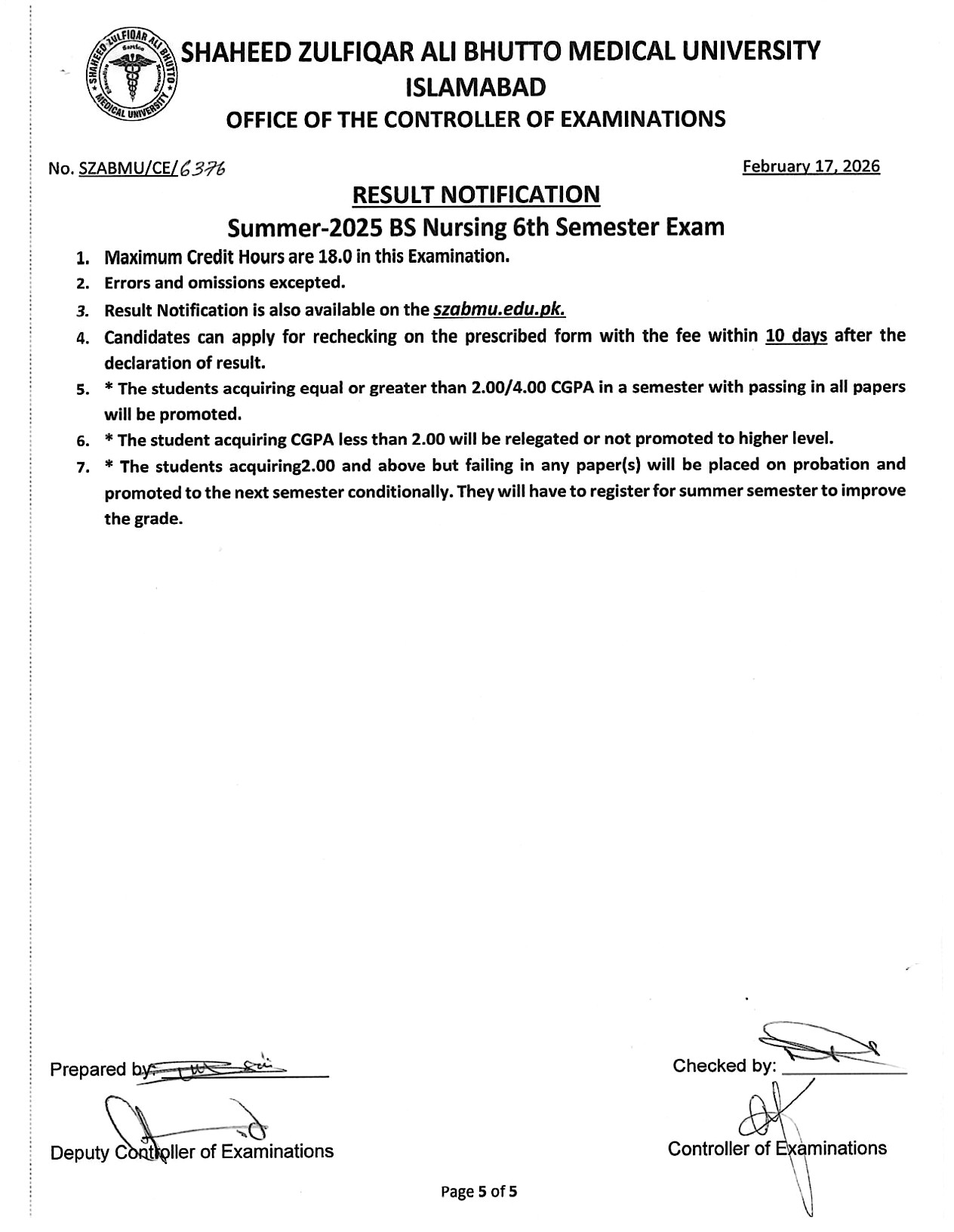 Result Notification - Summer 2025 BS Nursing 6th Semester Exam