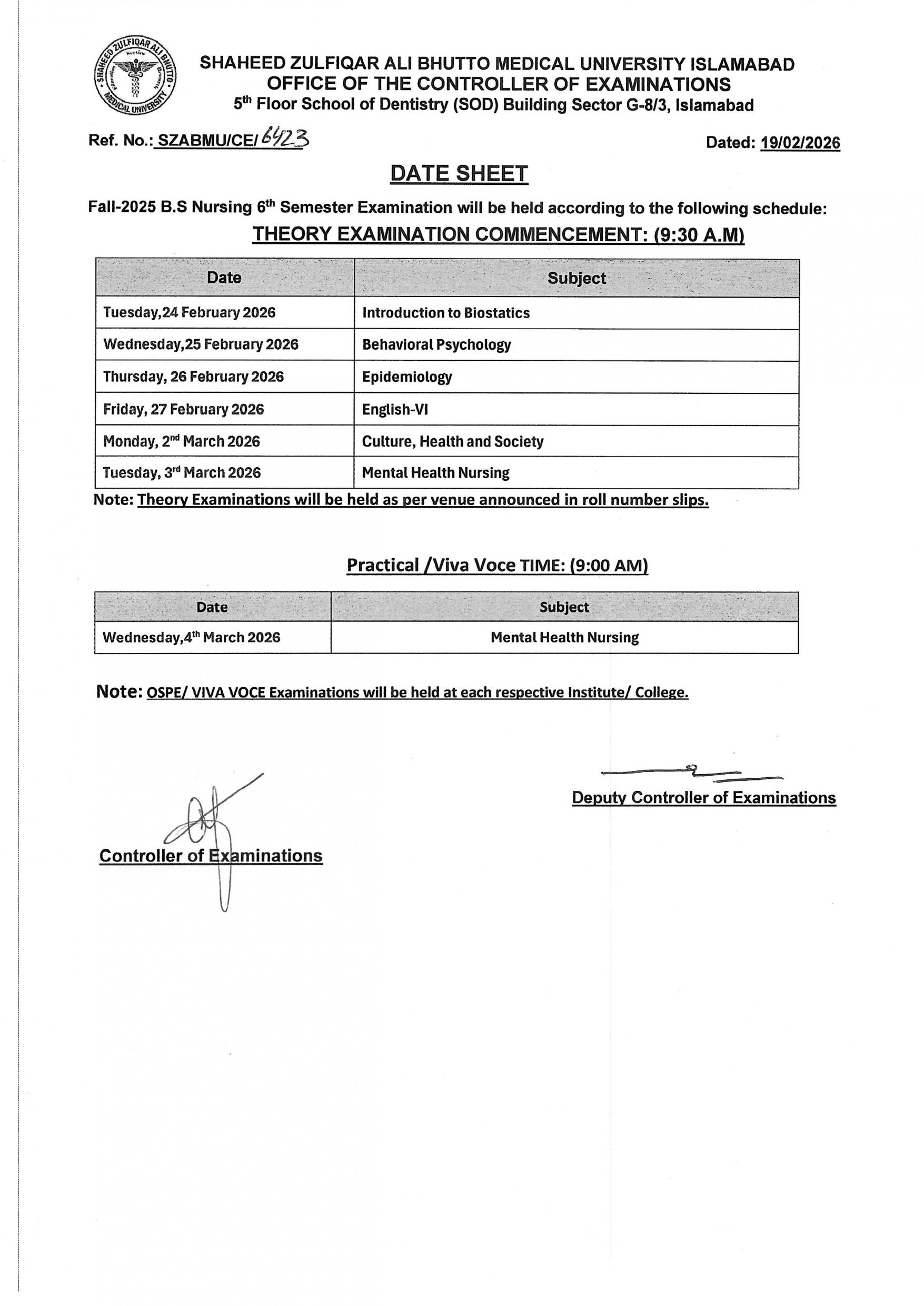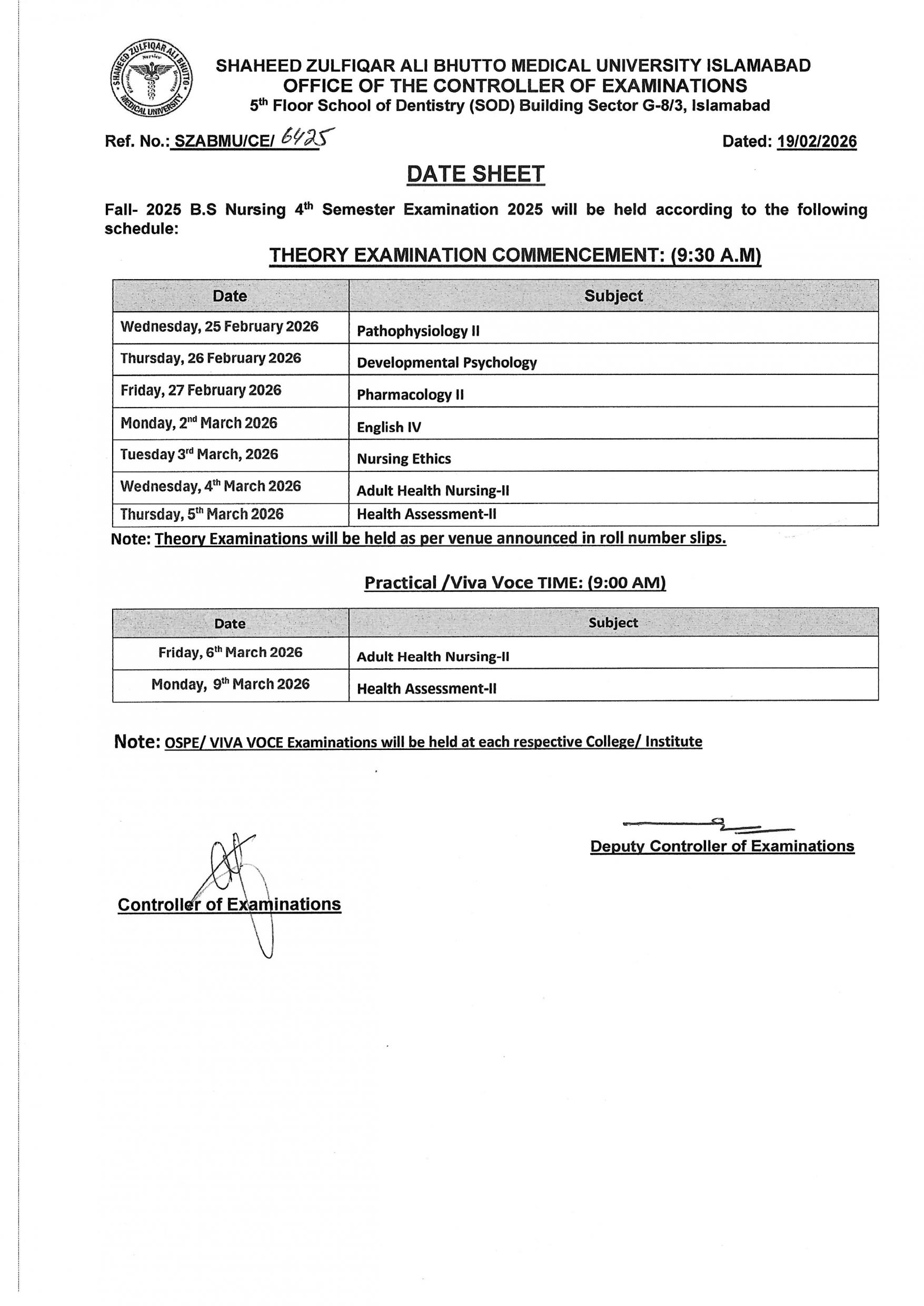 Date Sheet - Fall 2025 BS Nursing Exams