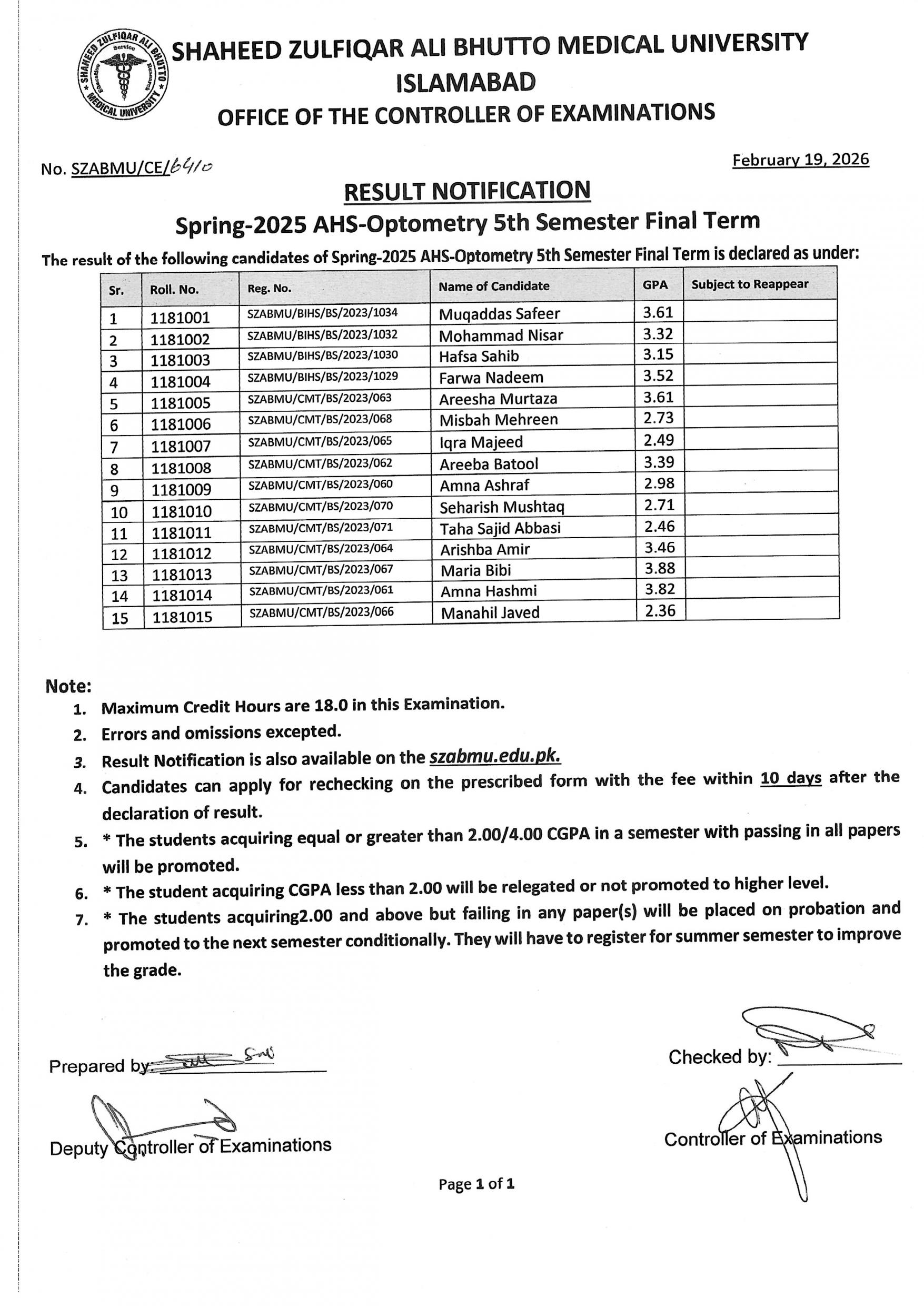 Spring 2025 AHS Optometry 5th Semester Final Term