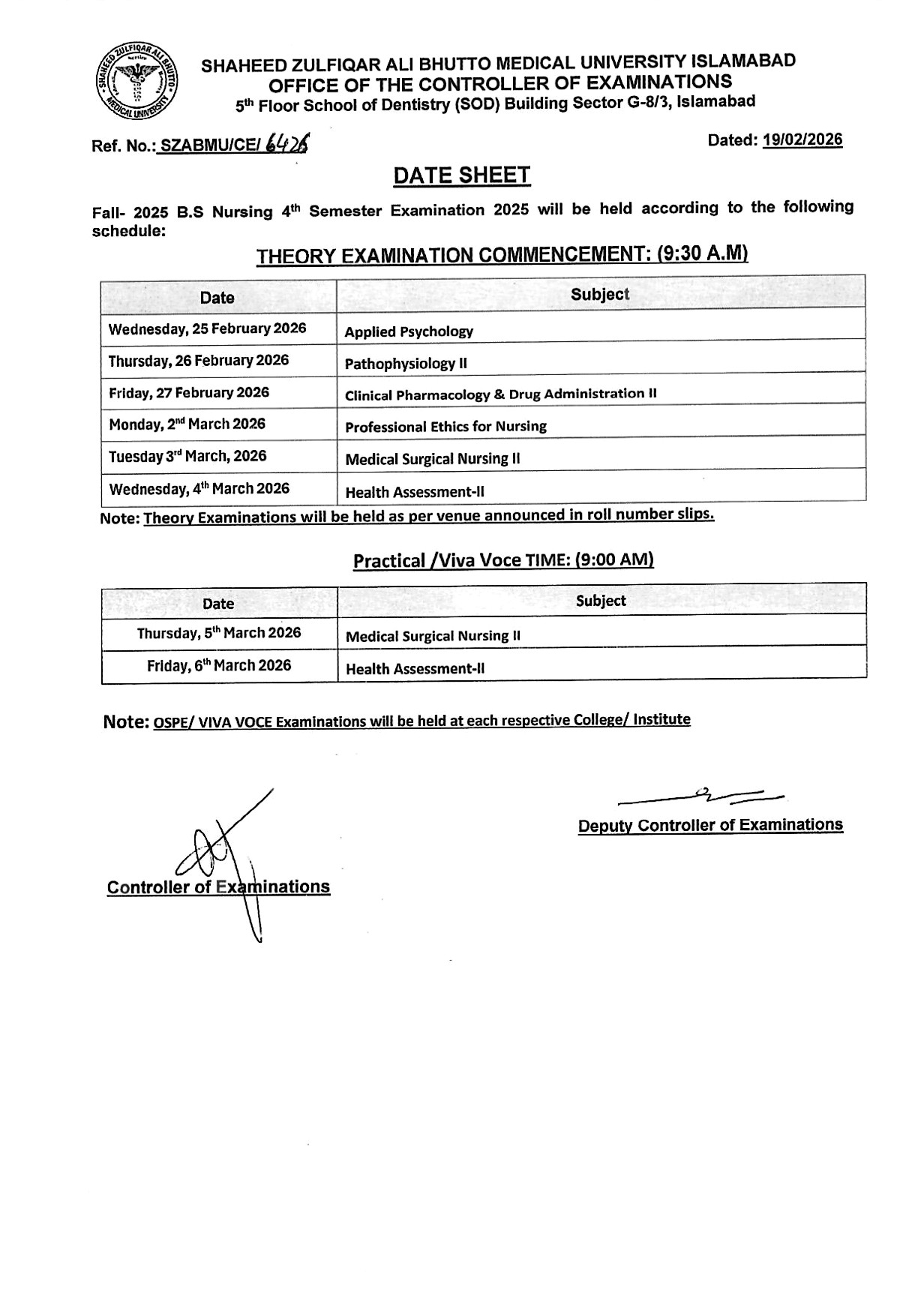 Date Sheet - Fall 2025 BS Nursing 4th Semester Exams New Curriculum