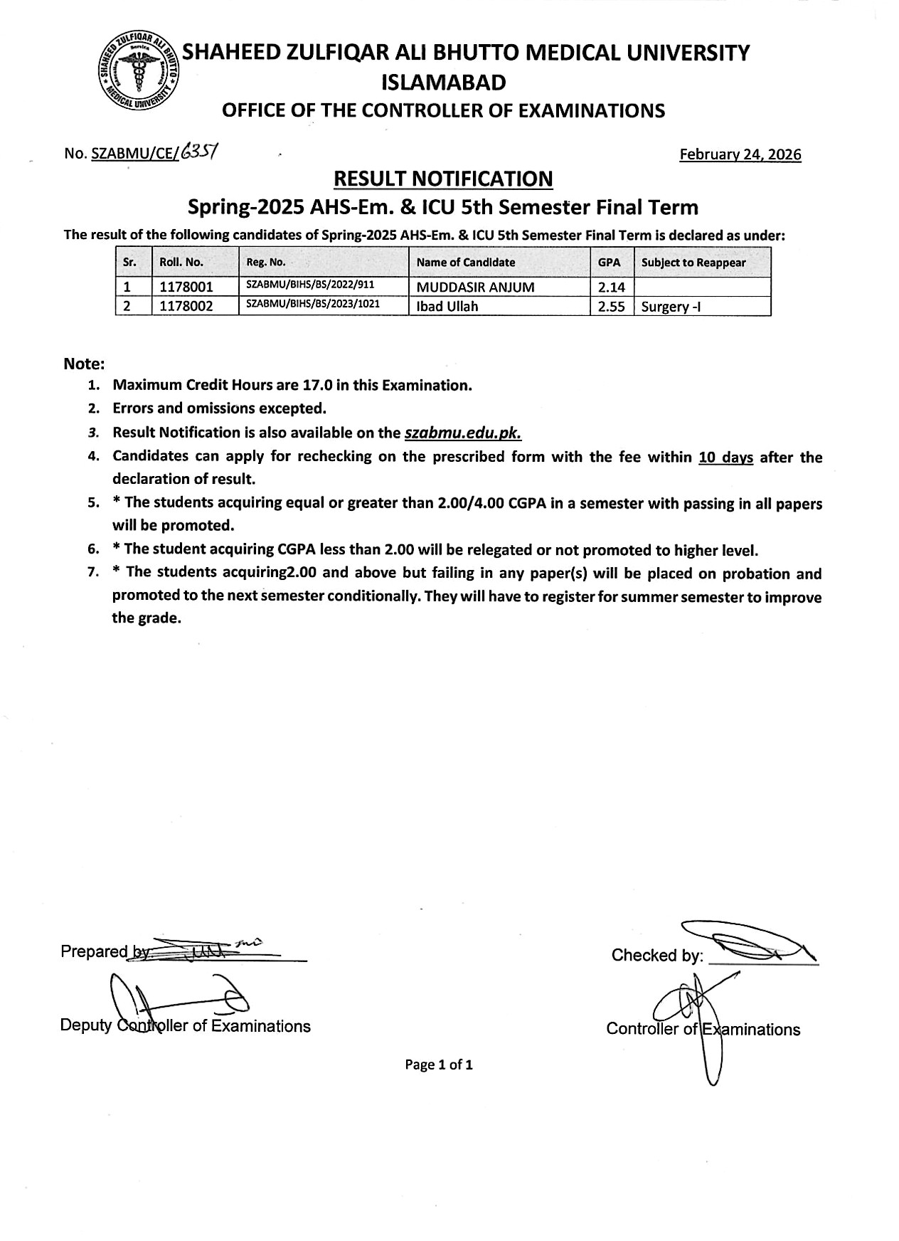 Result Notification - Spring 2025 AHS Em. & ICU 5th Semester Final Term