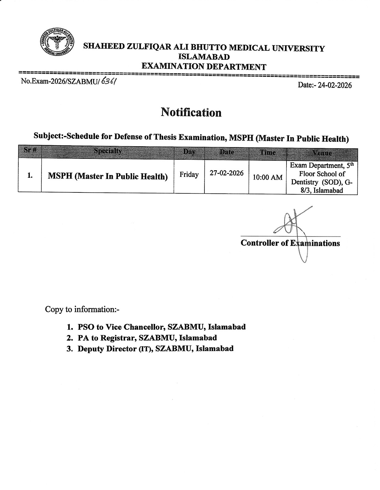 Schedule for Defense of Thesis Examination, MSPH (Master in Public Health)