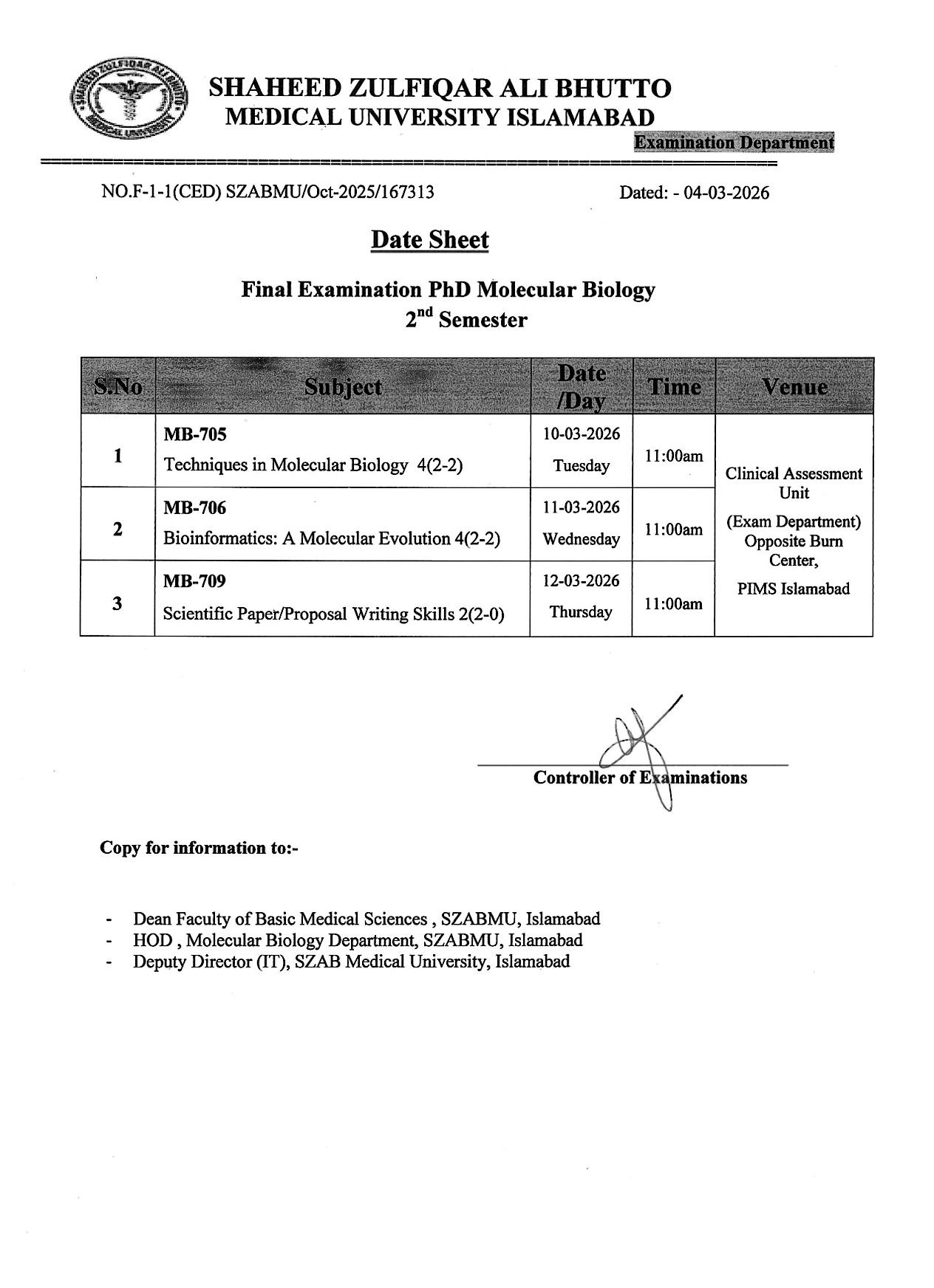 Date Sheet - Final Examination PhD Molecular Biology 2nd Semester