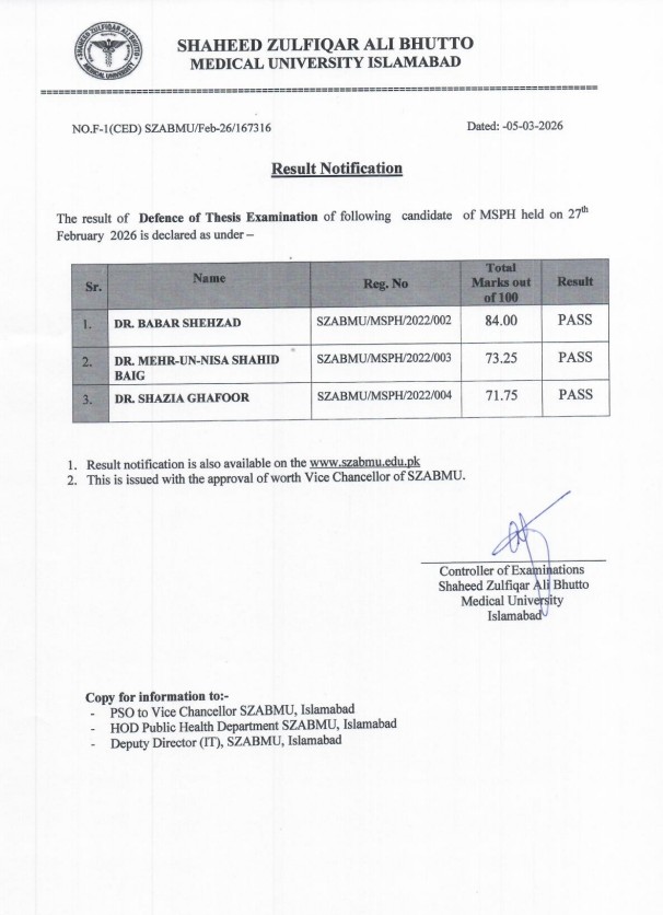 Result Notification - Defence of Thesis Examination of MSPH held on 27th February 2026