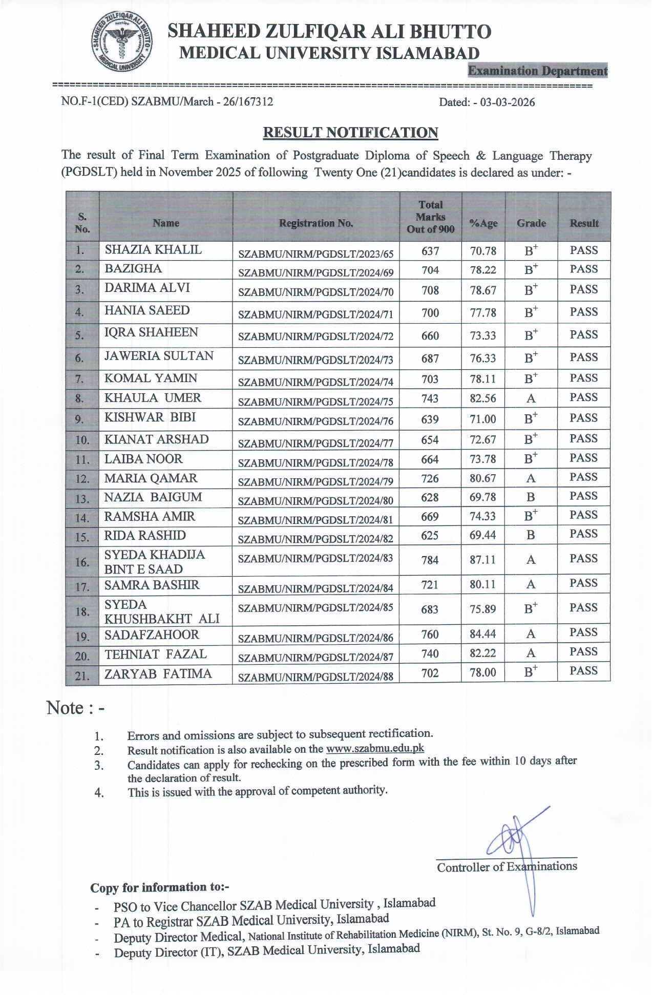 Result Notification - Postgraduate Diploma in Speech & Language Therapy ( PGDSLT) session 2024-2025