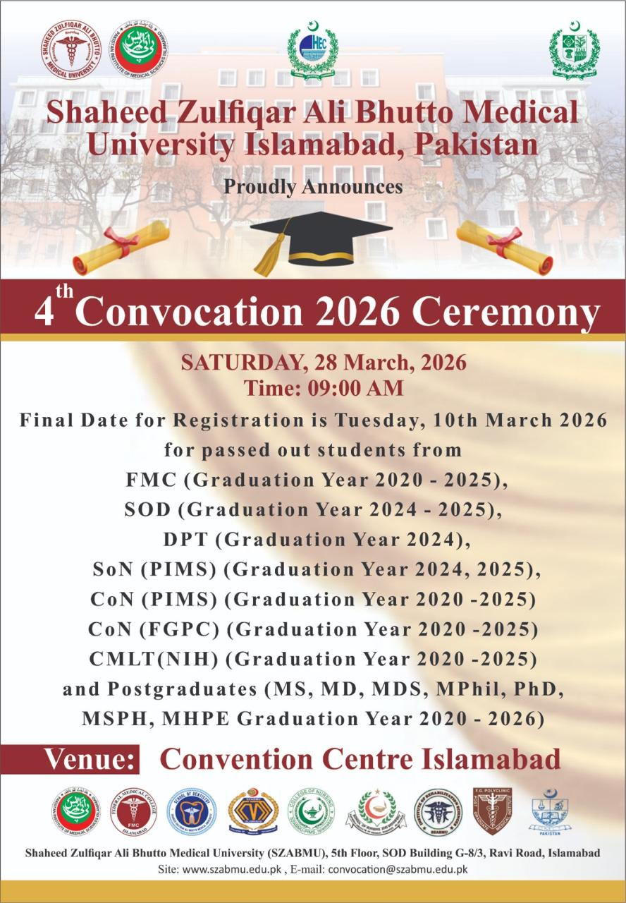 4th convocation of Shaheed Zulfiqar Ali Bhutto Medical University Islamabad is schedule to be held on 28 March, 2026