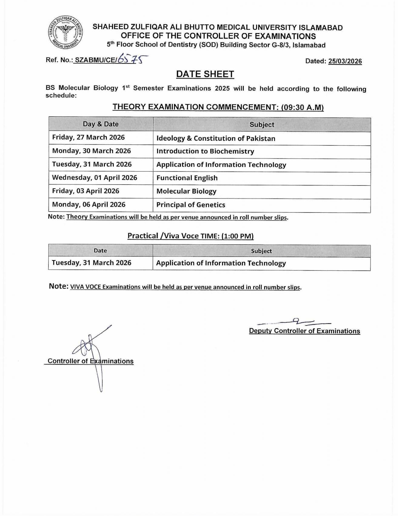 Date Sheet - BS Molecular Biology 1st Semester Exam 2025