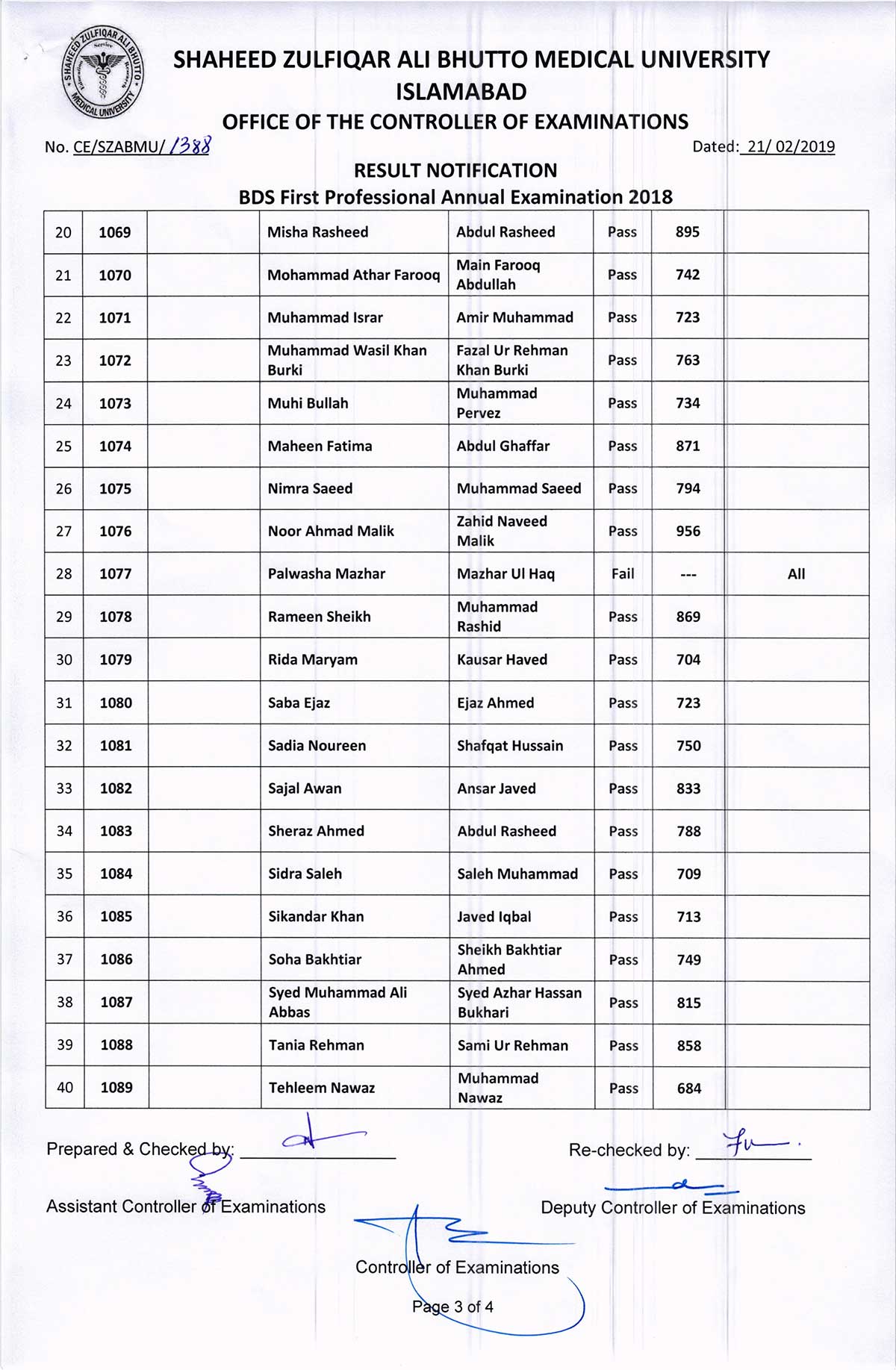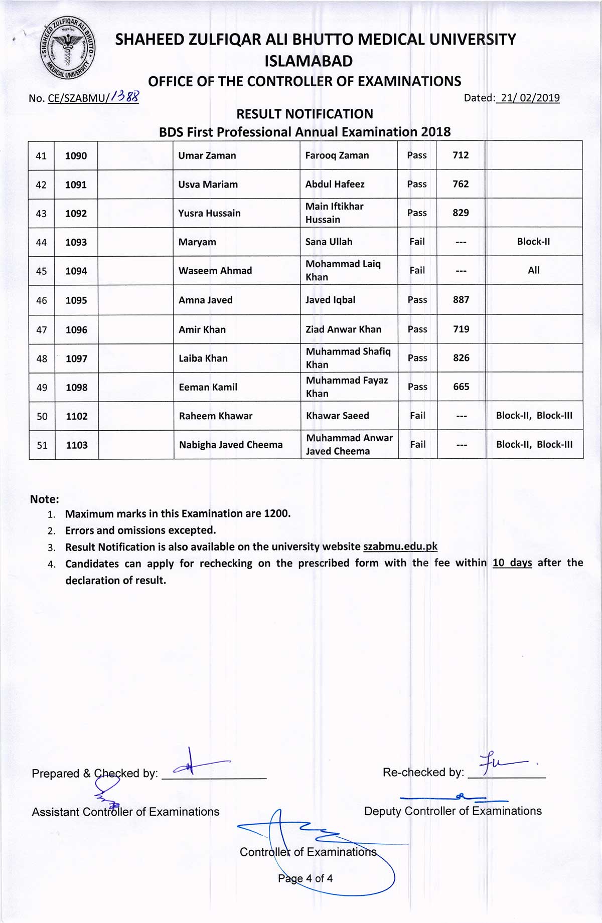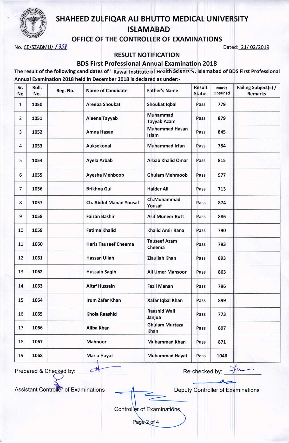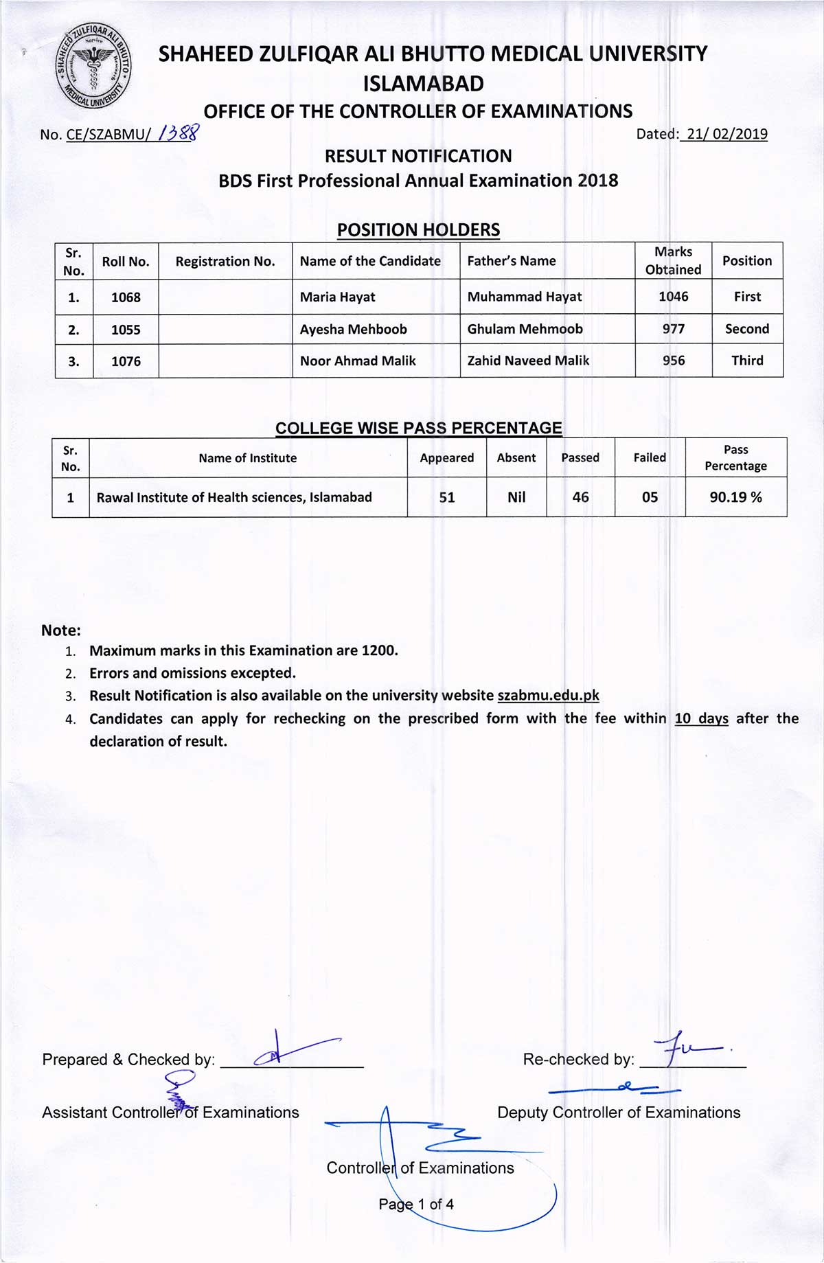 Result Notification of R.I.H.S. BDS FIRST PROFESSIONAL ANNUAL EXAMINATION 2018