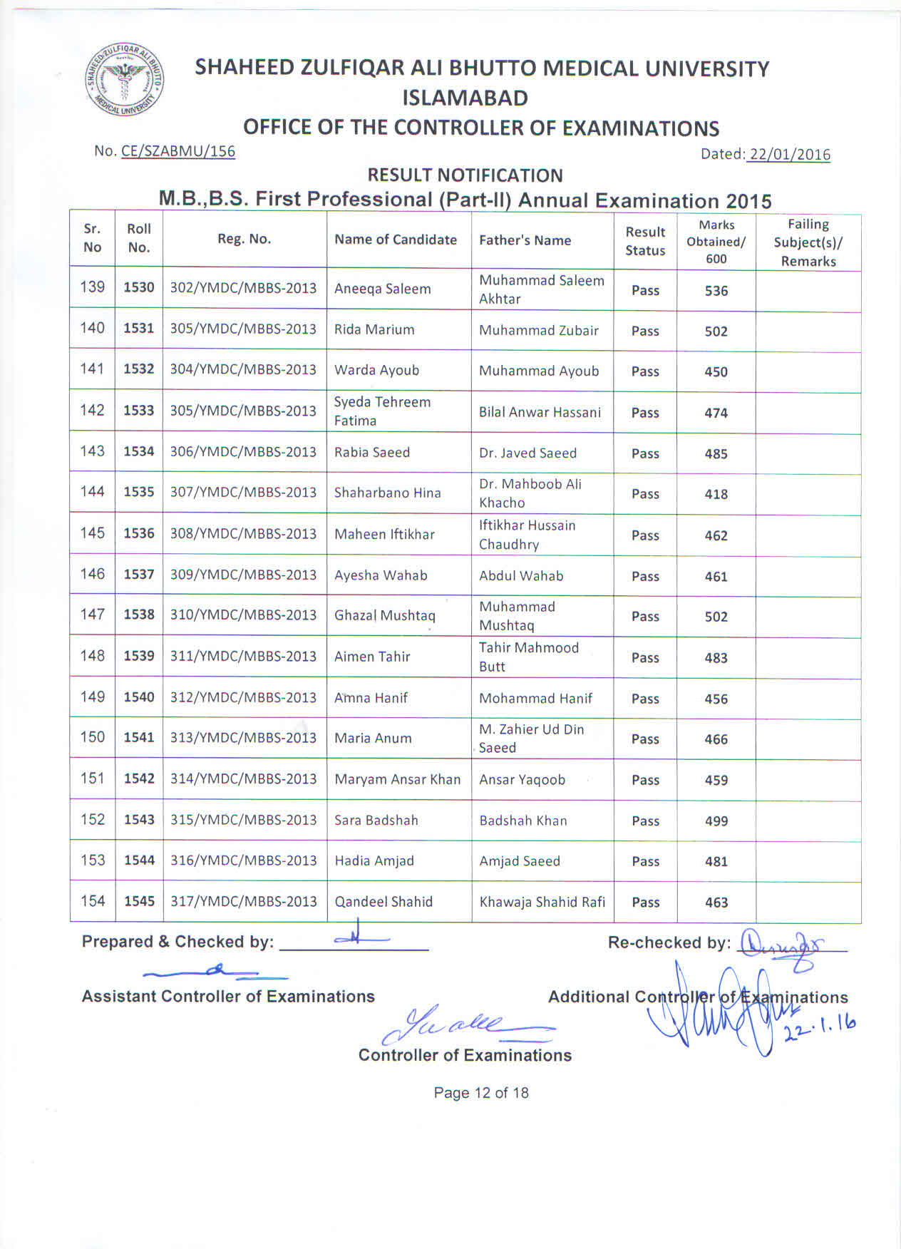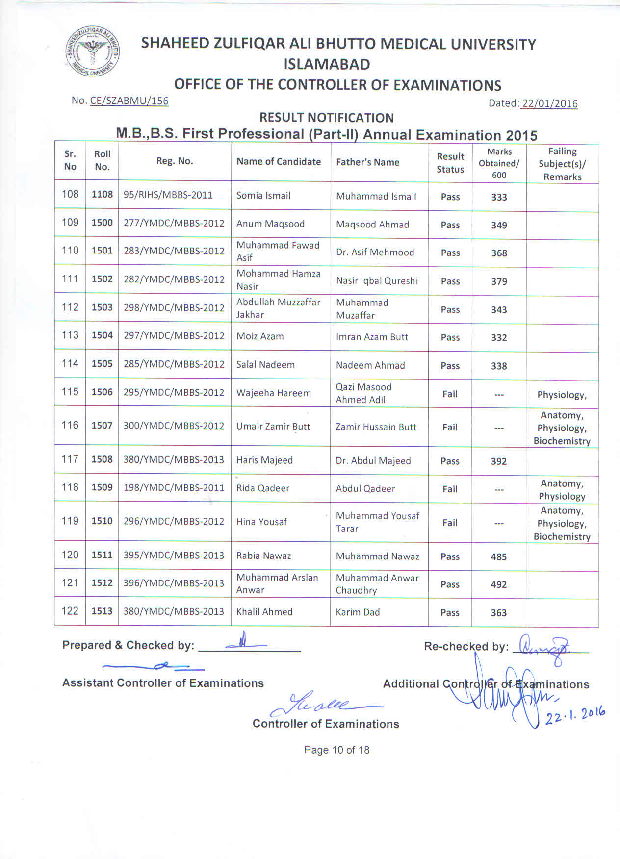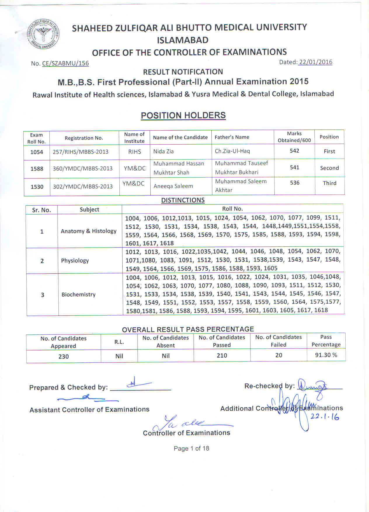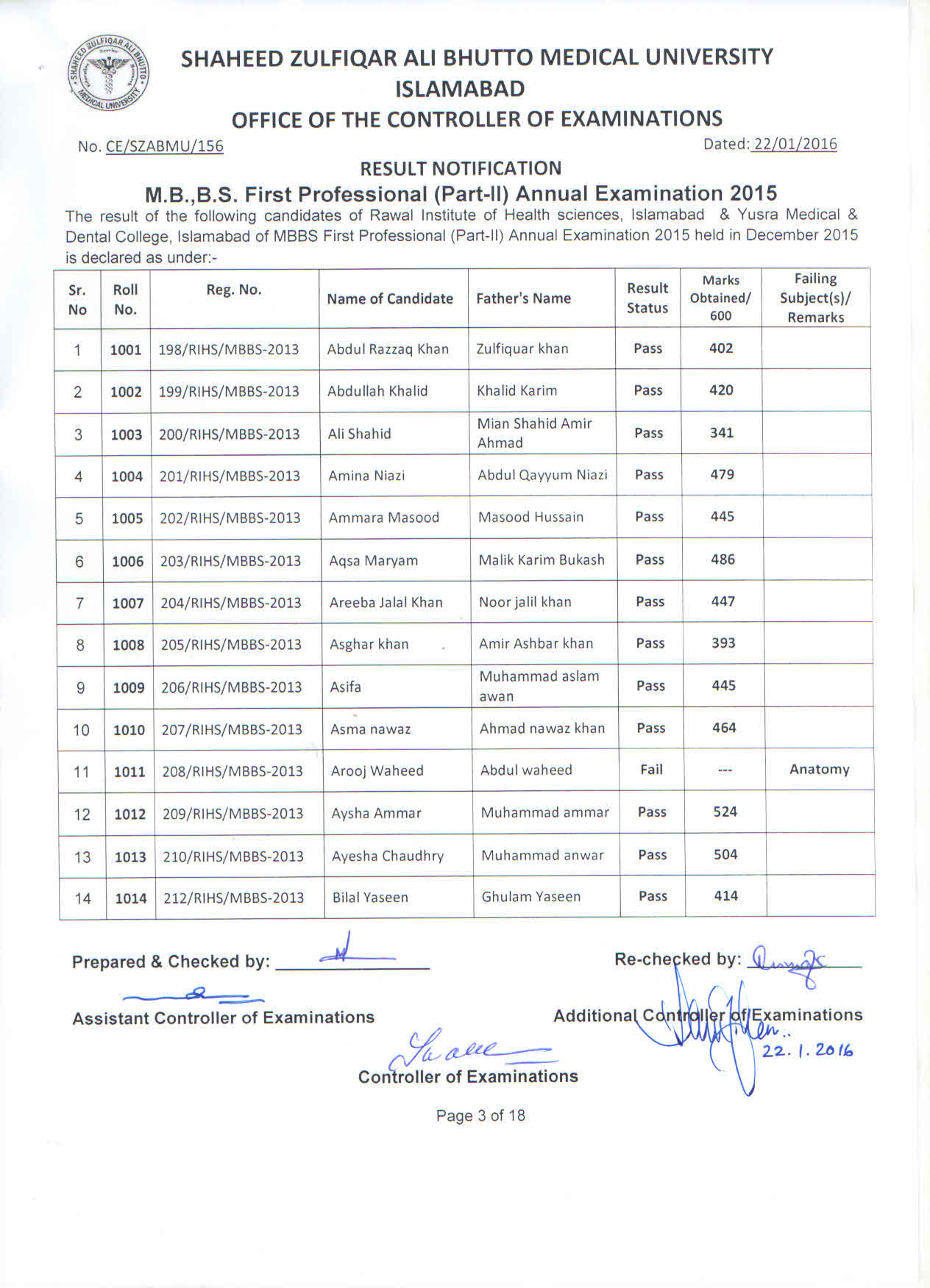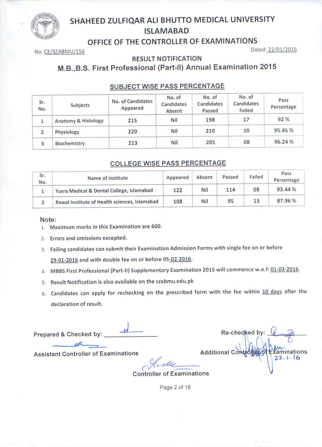 The result of Rawal Institute of Health Sciences, Islamabad and Yusra Medical & Dental College, Islamabad for MBBS 1st Professional Part-II Annual Examination 2015.