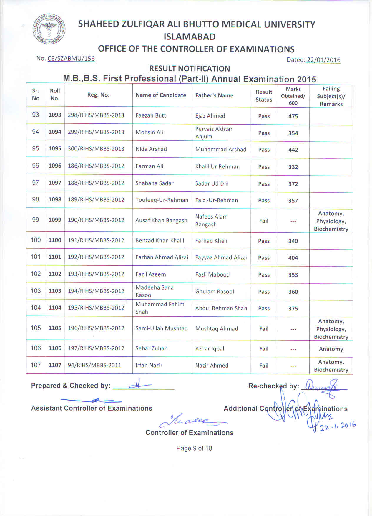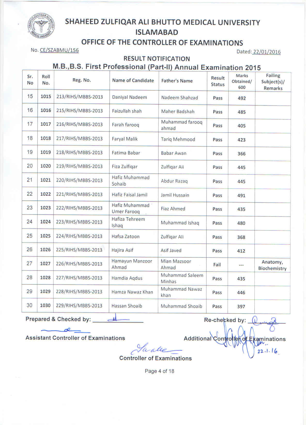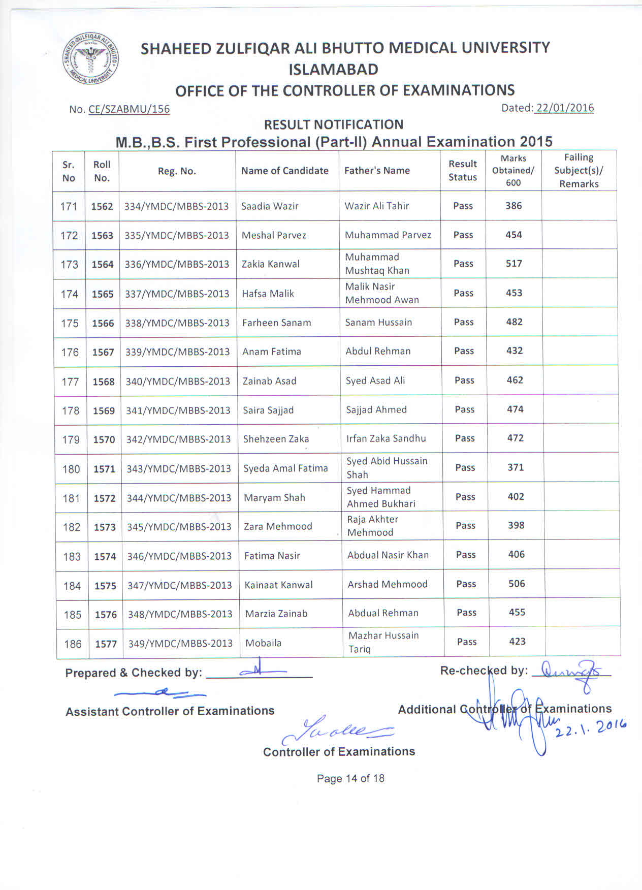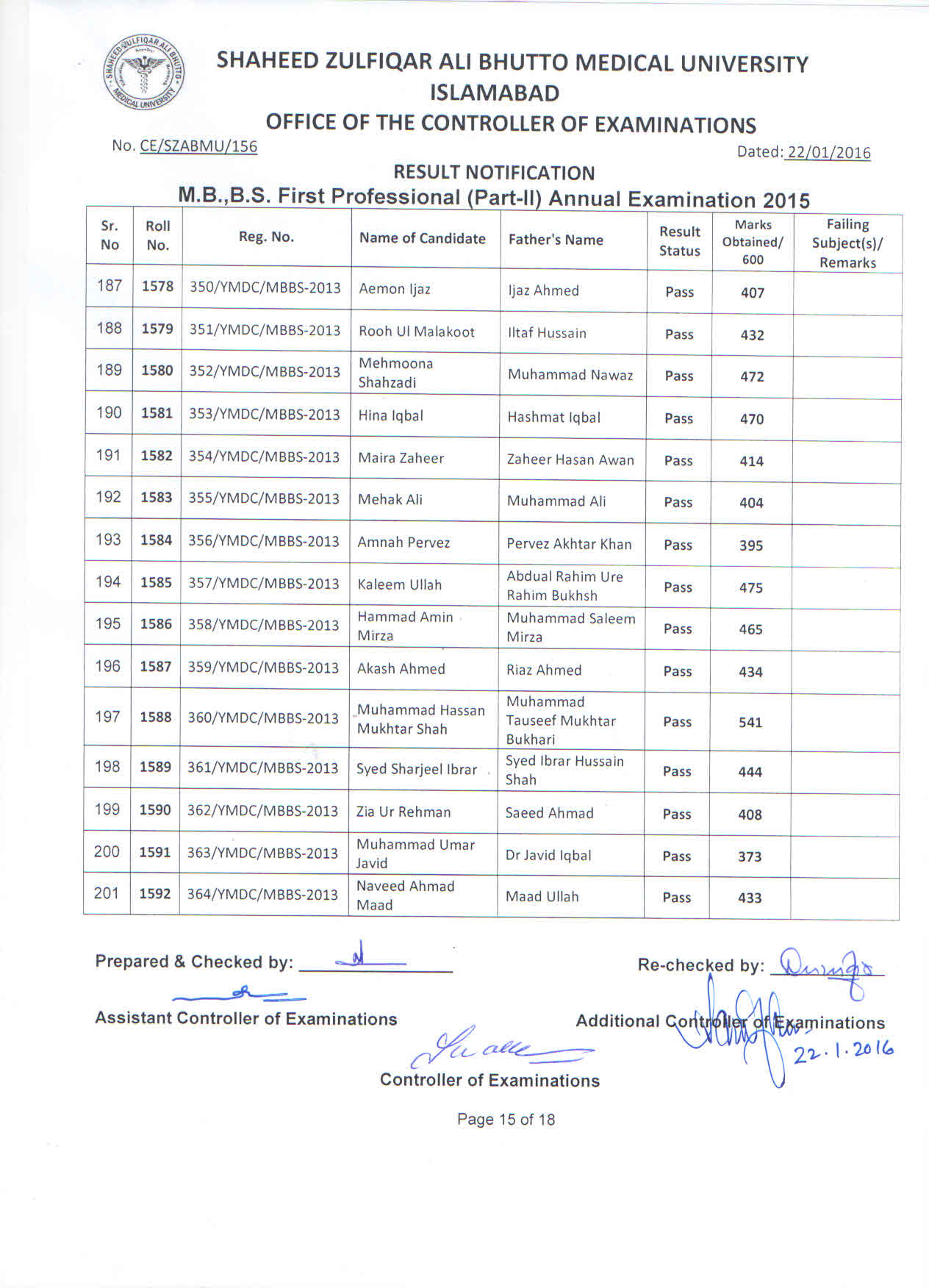 Result MBBS 1st Professional Part-II Annual Examination 2015