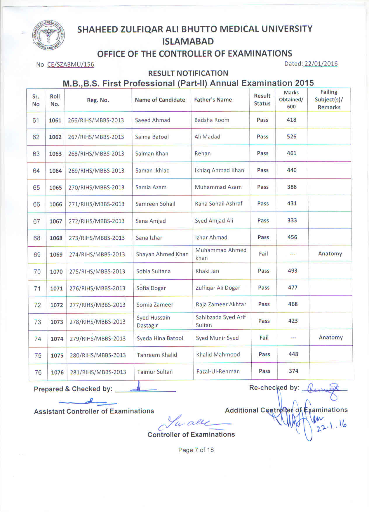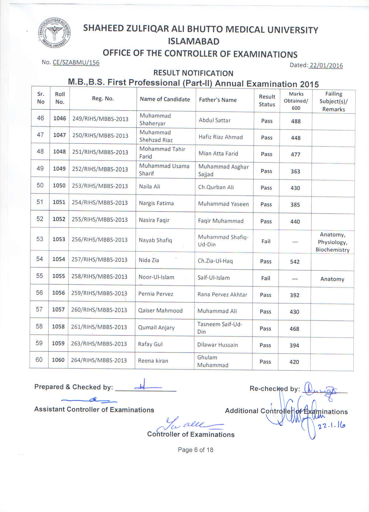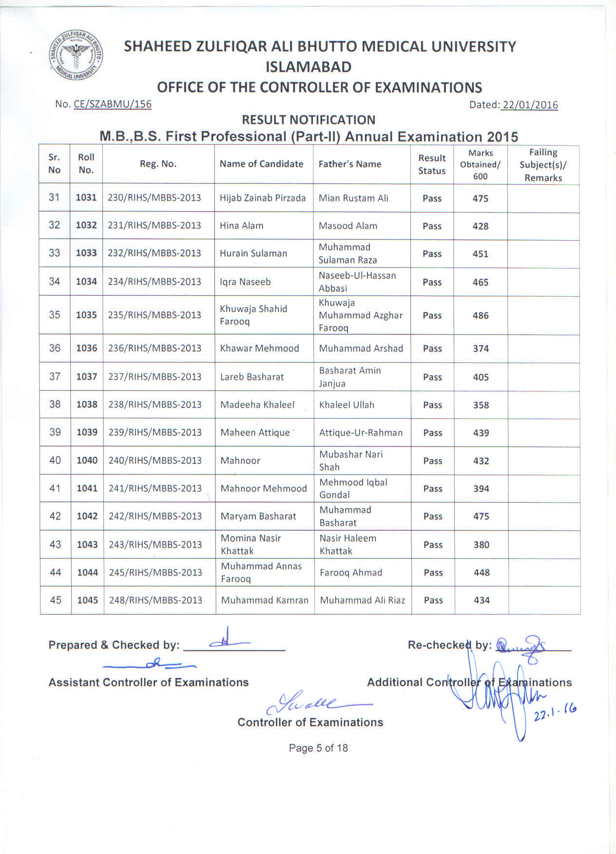 Result MBBS 1st Professional Part-II Annual Examination 2015