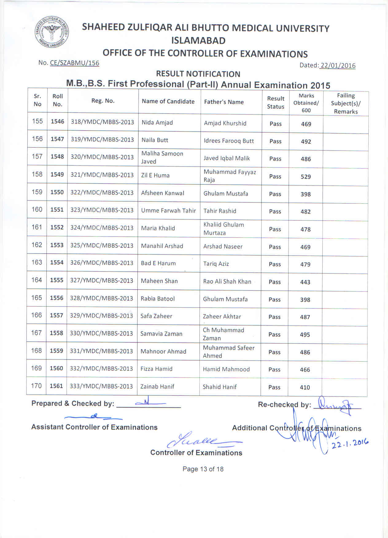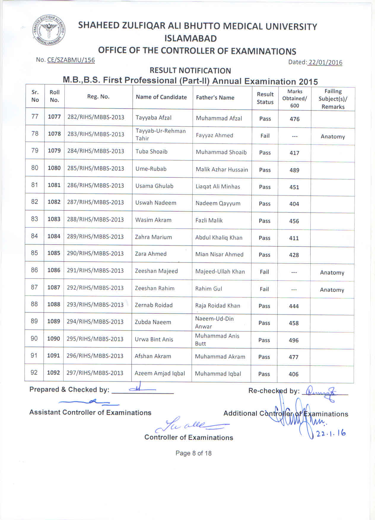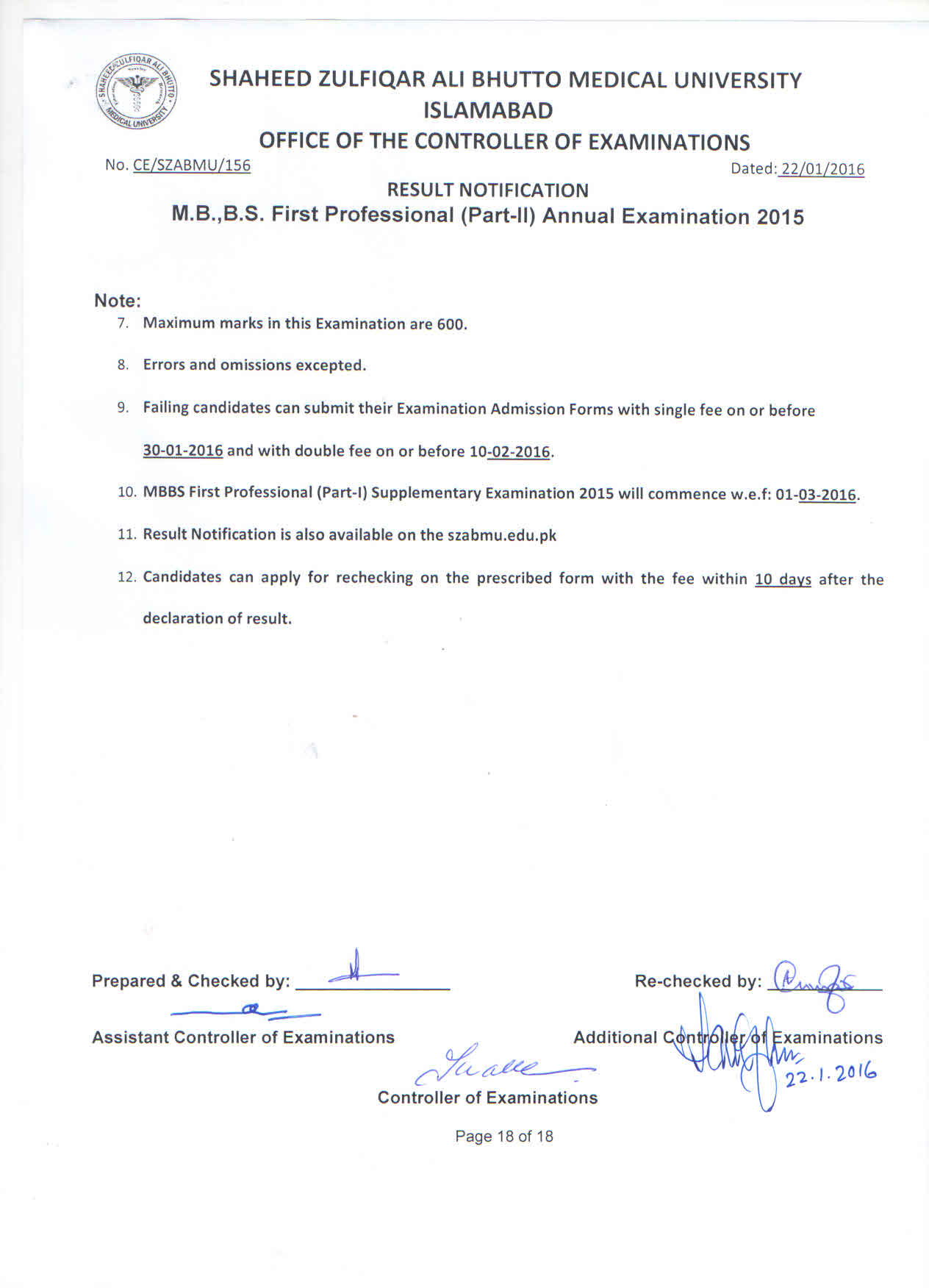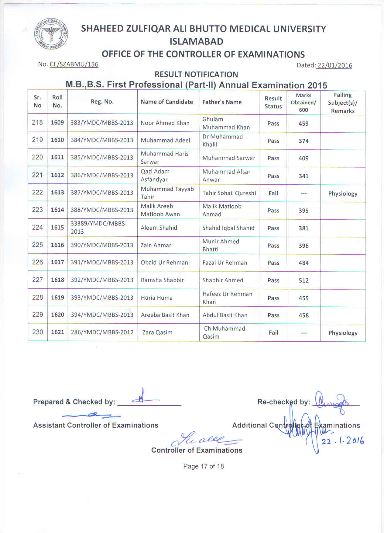 Result MBBS 1st Professional Part-II Annual Examination 2015