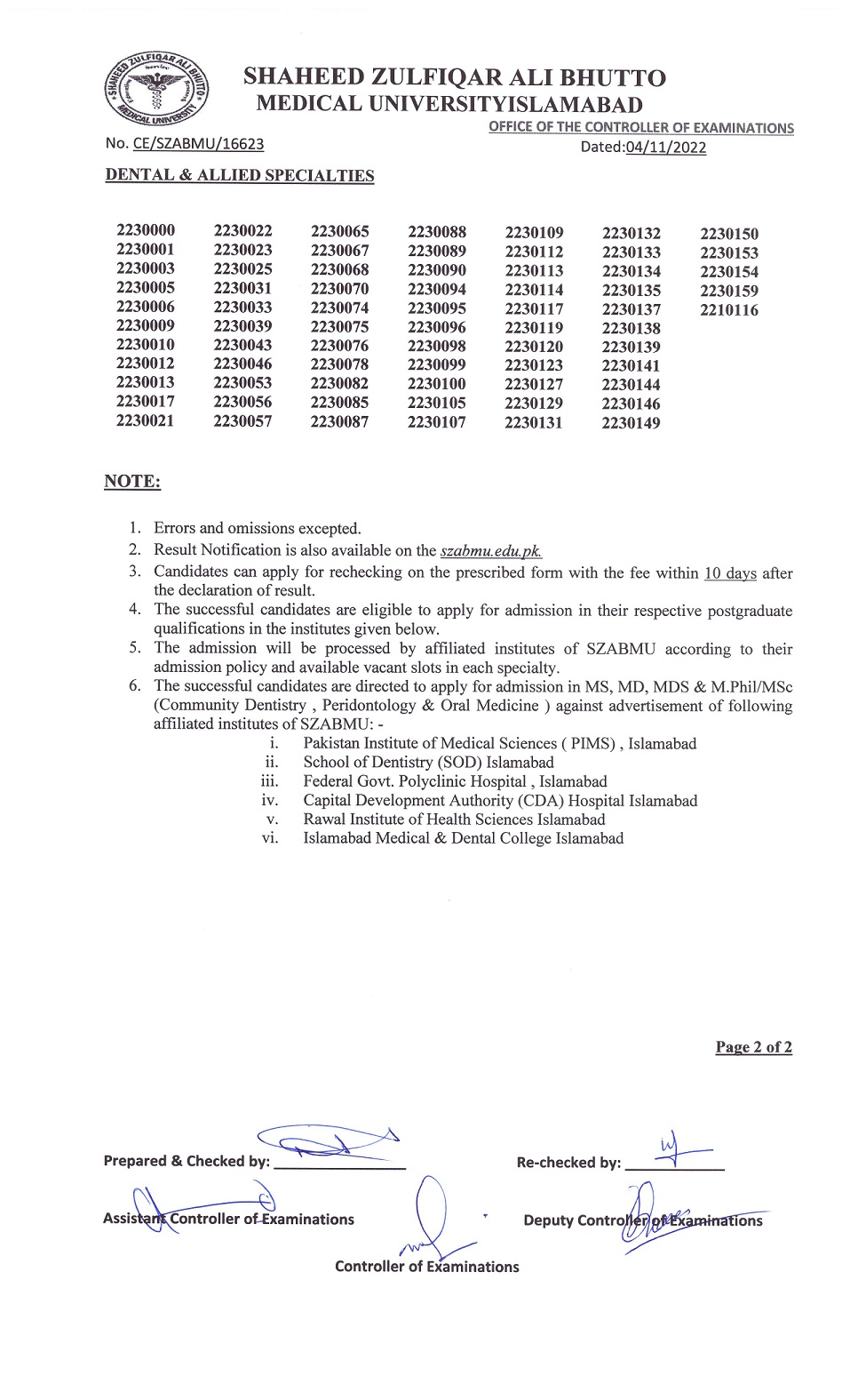 Result Notification of Part-I Examination 2022 for MS, MD, MDS, MPhil and M.Sc. Programmes