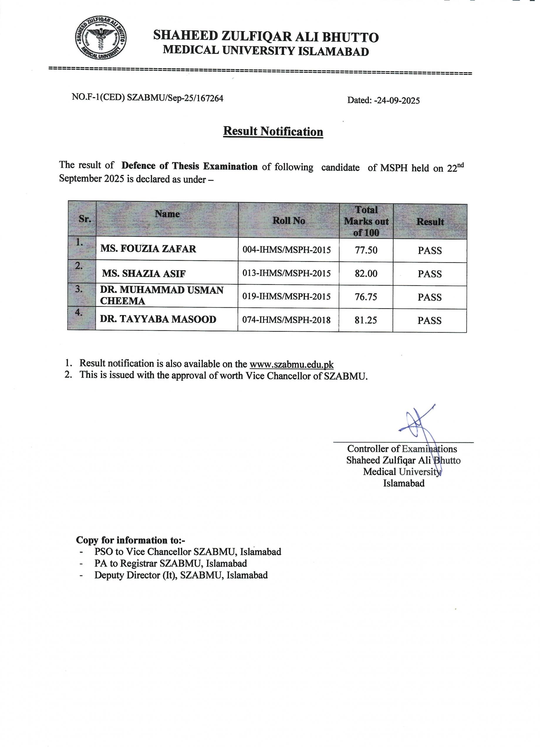 Result Notification - Defence of Thesis Examination of MSPH held on 22nd September 2025