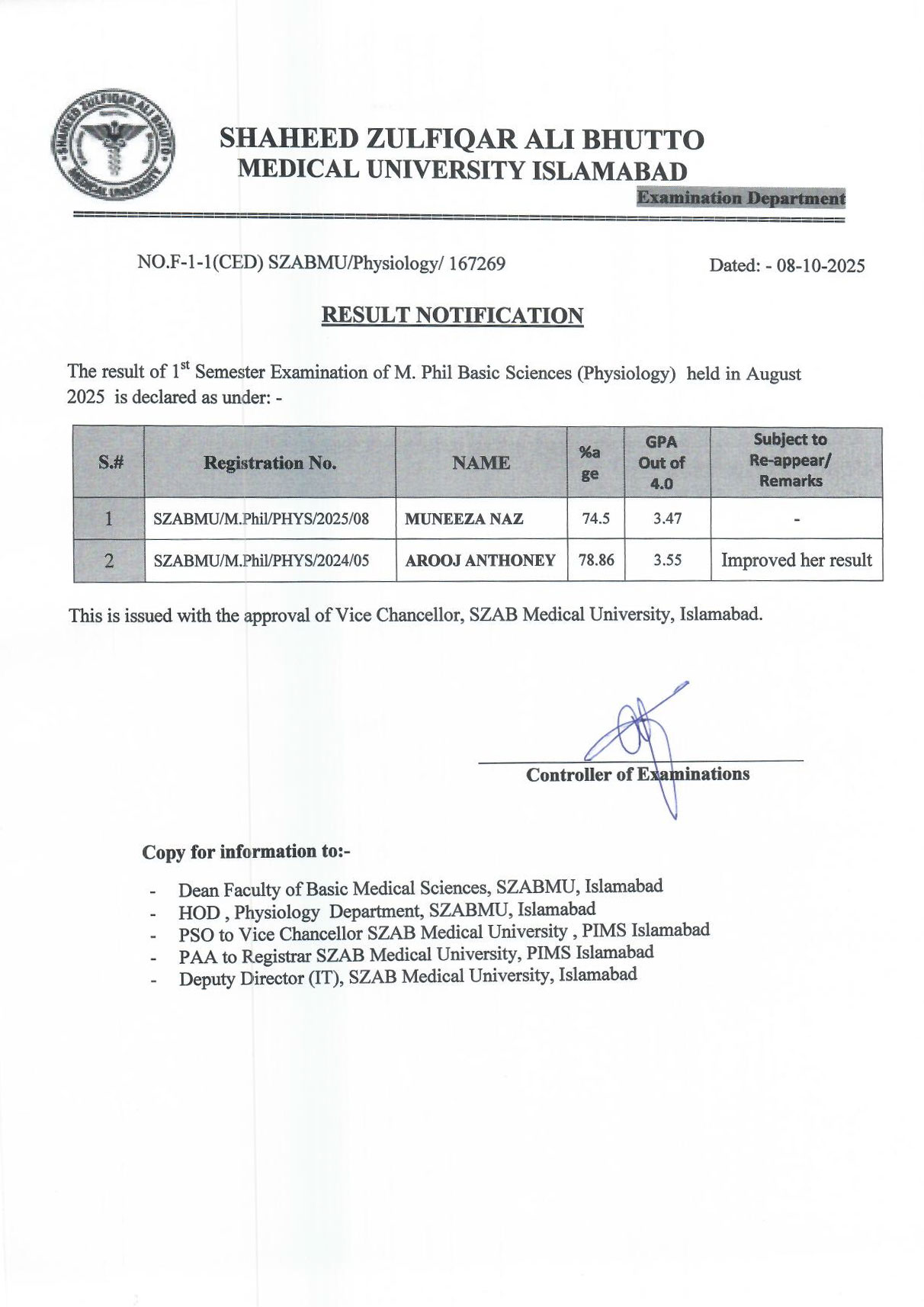Result Notification M.Phil. Basic Medical Sciences Physiology