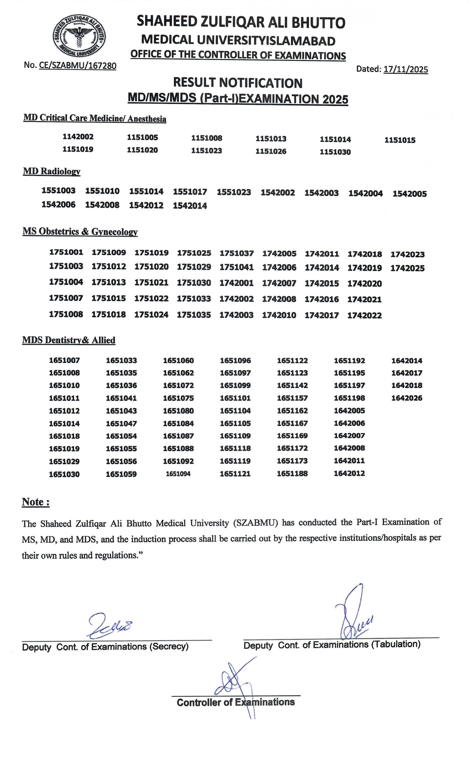 The Shaheed Zulfiqar Ali Bhutto Medical University (SZABMU) has conducted the Part-I Examination of MS, MD, and MDS, and the induction process shall be carried out by the respective institutions/hospitals as per their own rules and regulations.
