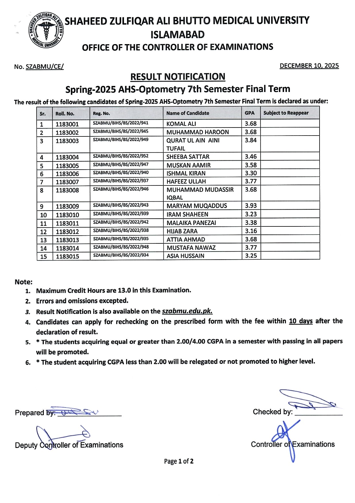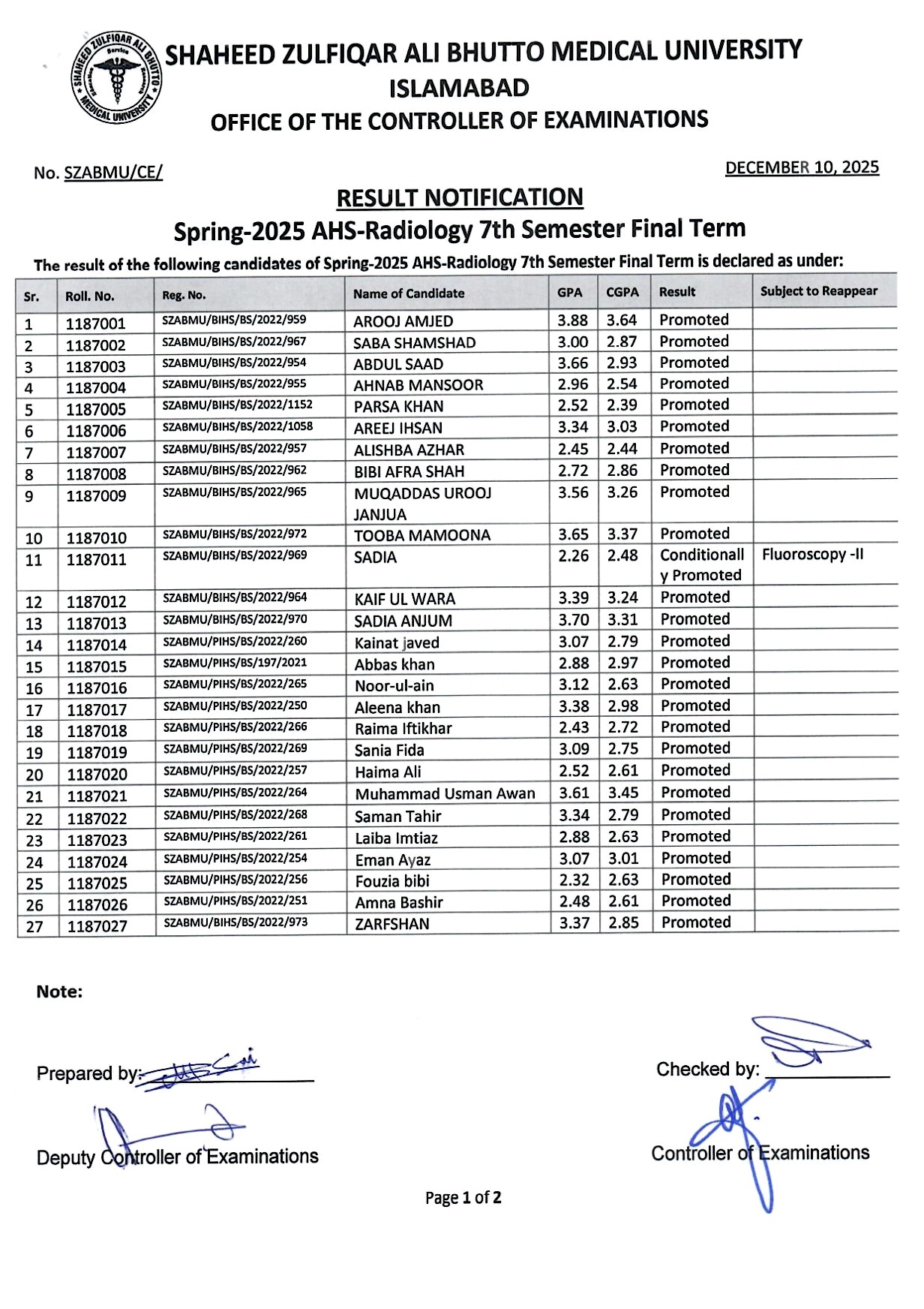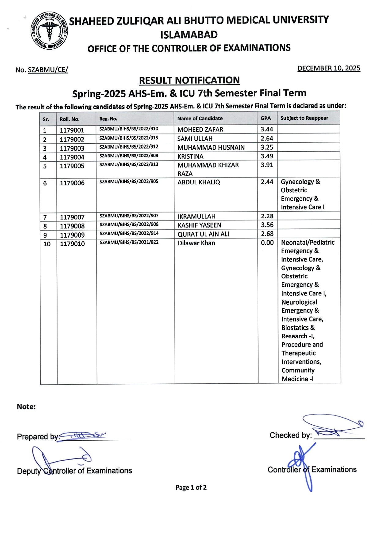 Result Notification - Spring 2025 AHS 7th Semester Final Term
