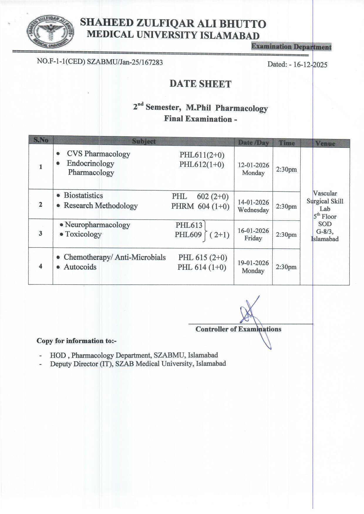 Date Sheet - 2nd Semester M.Phil. Pharmacology Final Examination