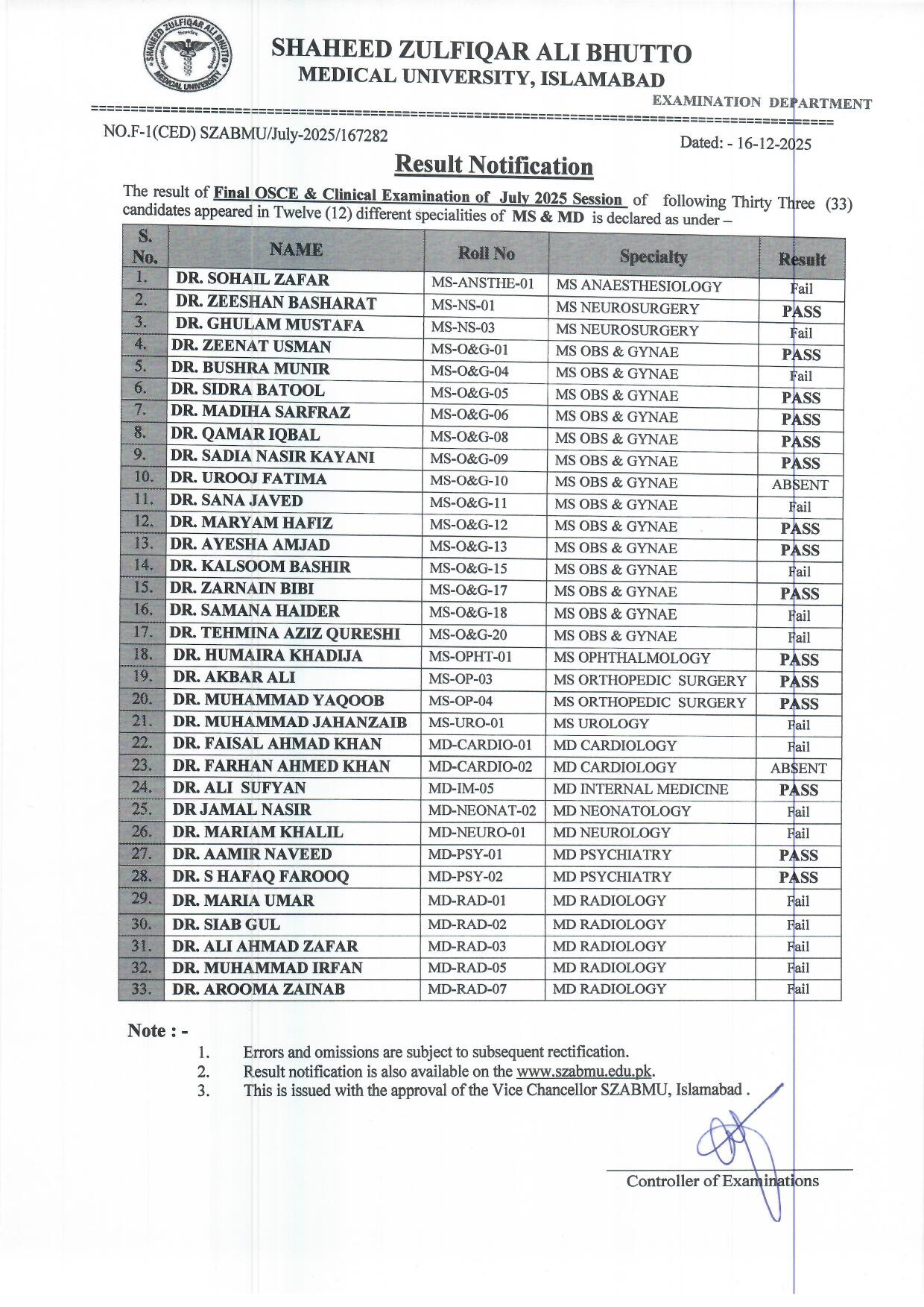 Result Notification - OSCE & Clinical Examination MS/MD Session July 2025