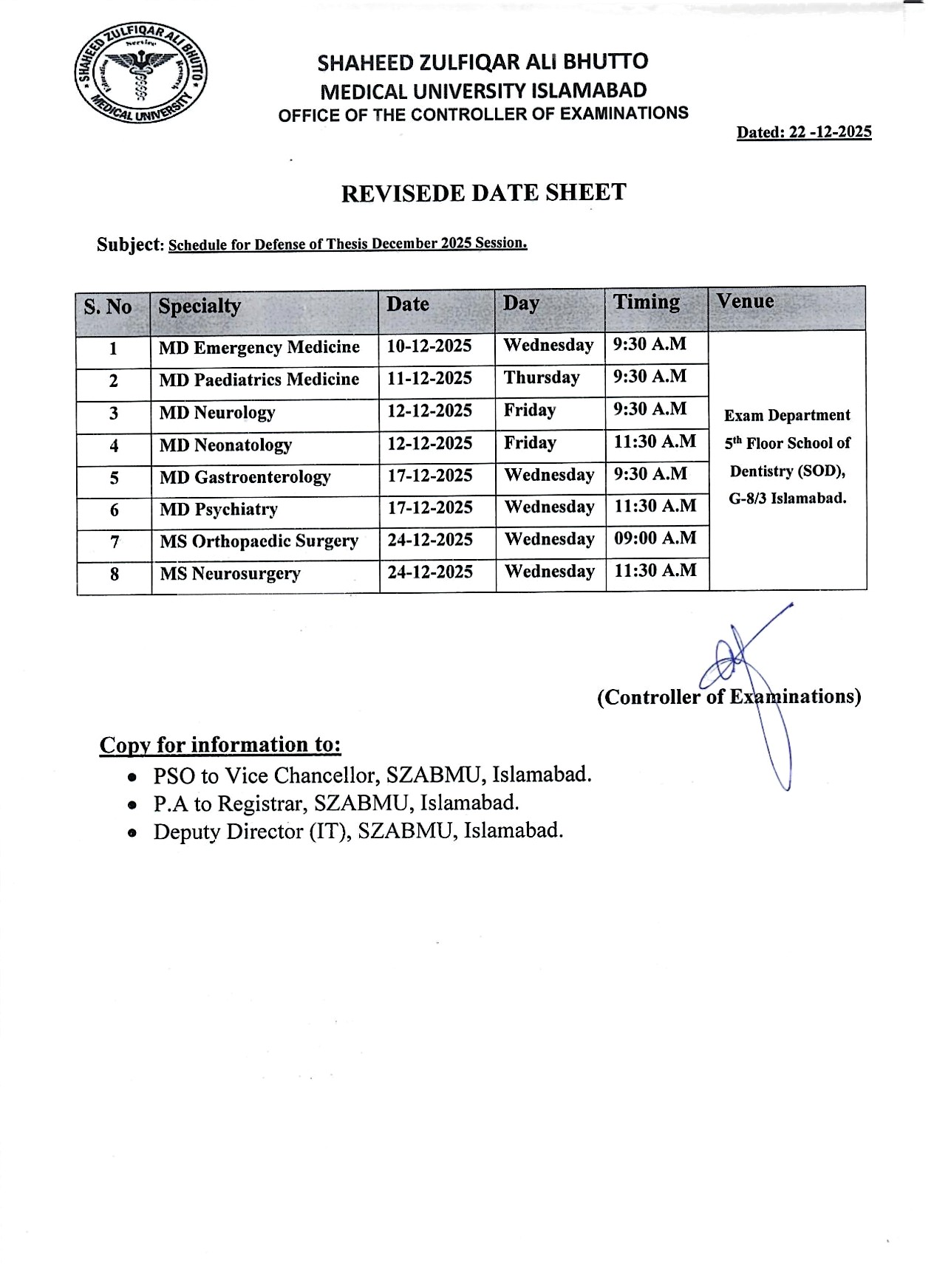 Revised Schedule for Defense of Thesis Examinations December 2025 Session