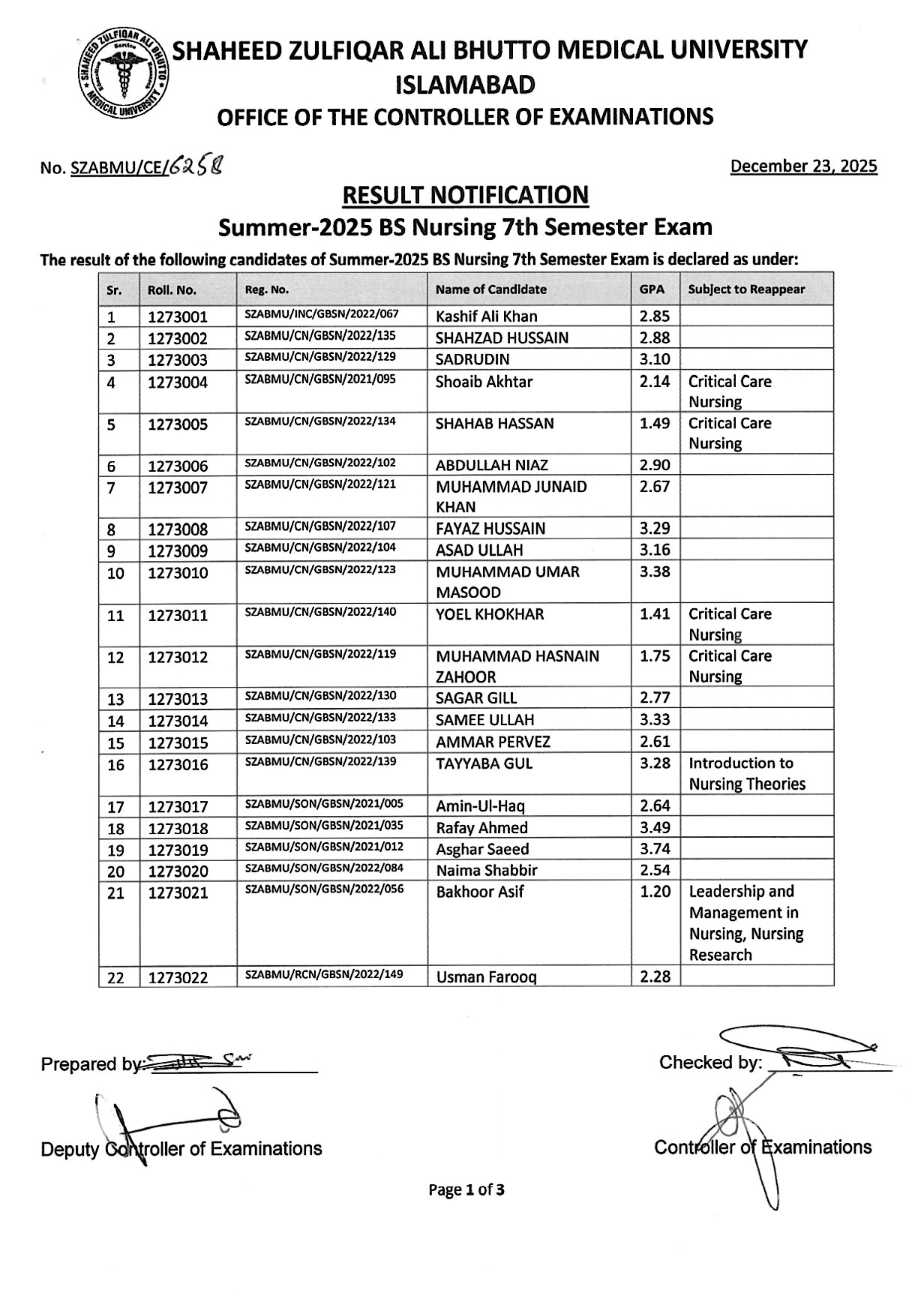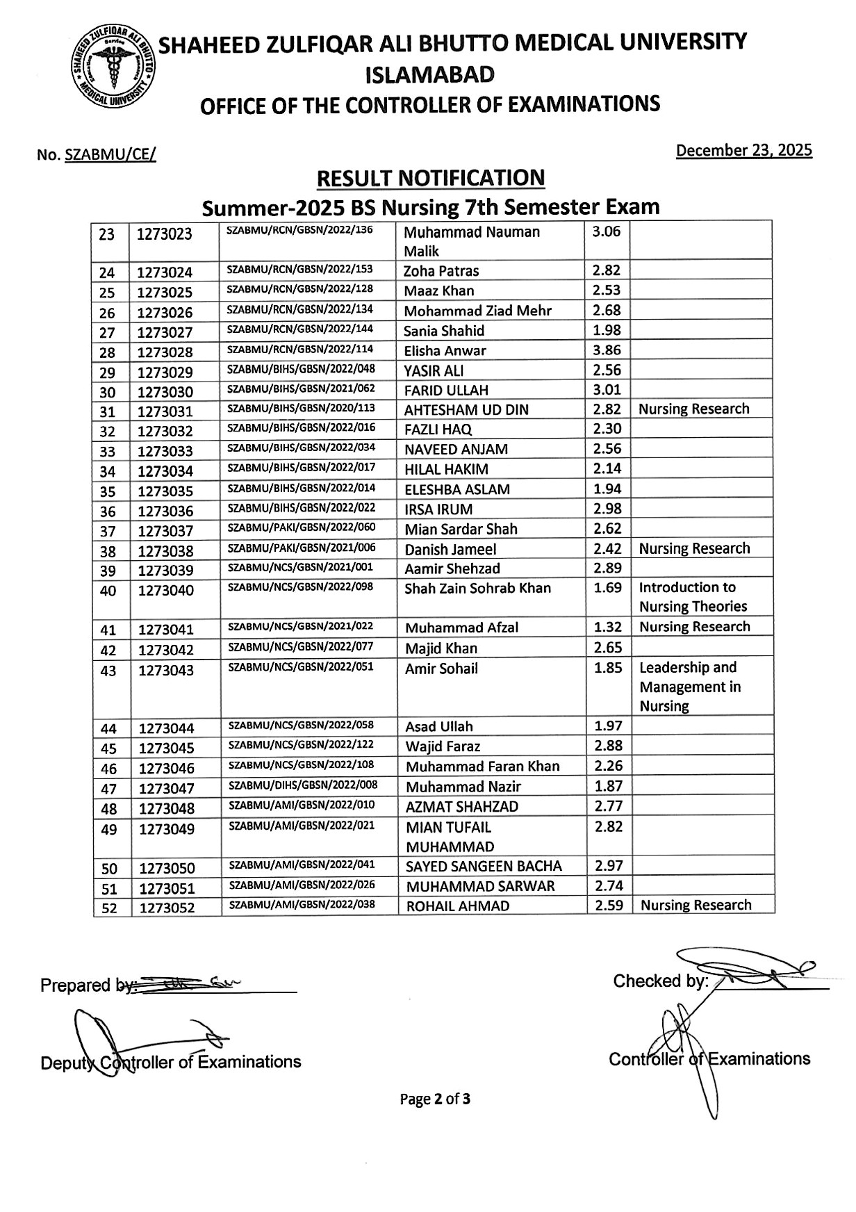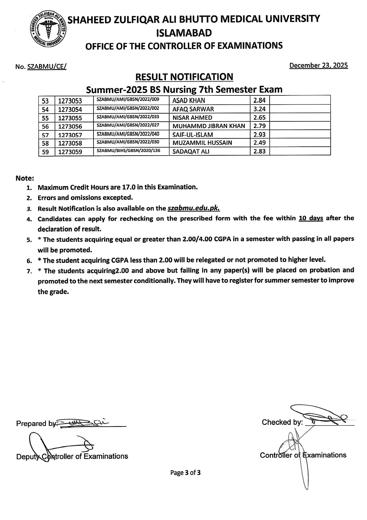 Result Notification - Summer 2025 BS Nursing 7th Semester Exam