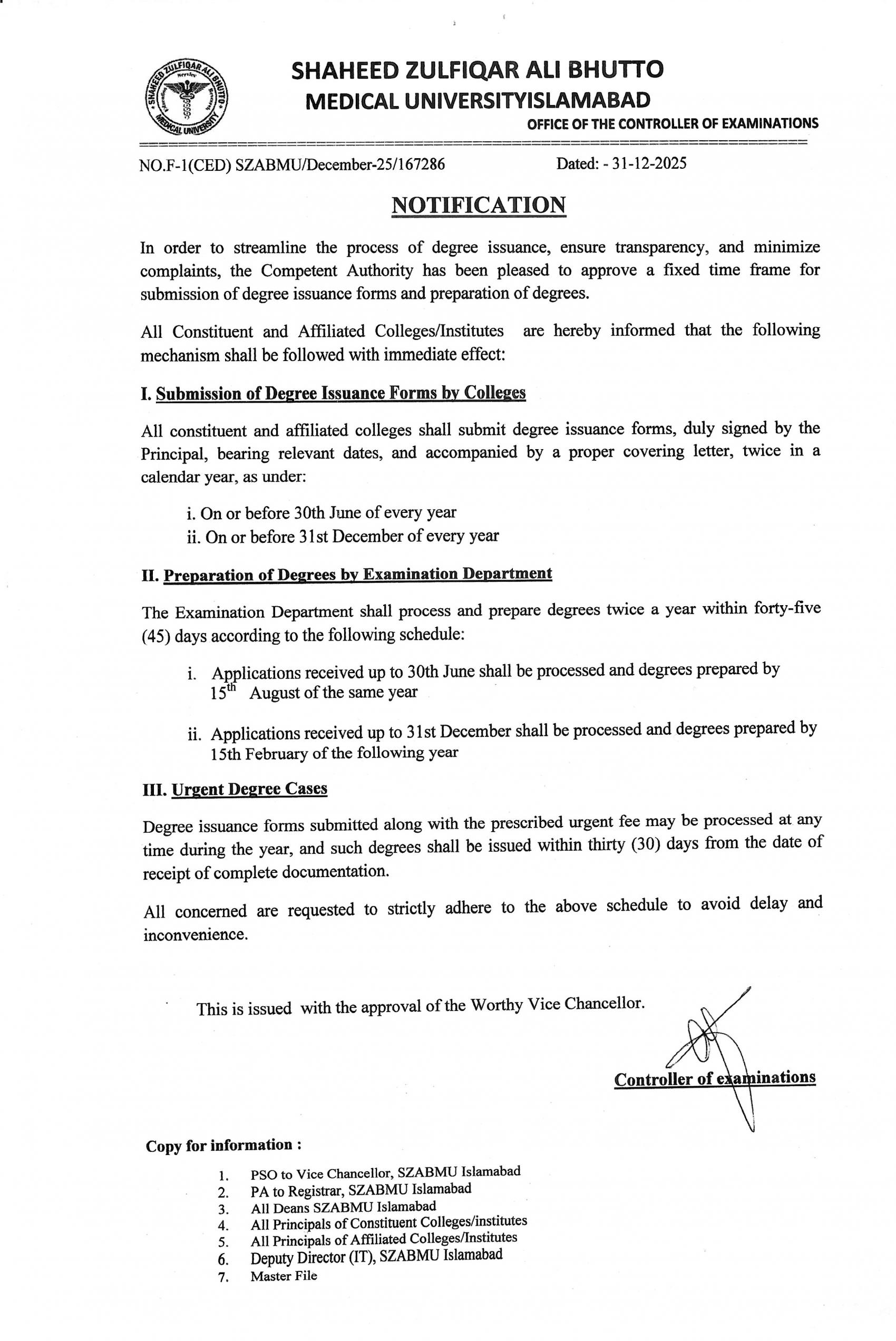 Notification - For Degree Issuance