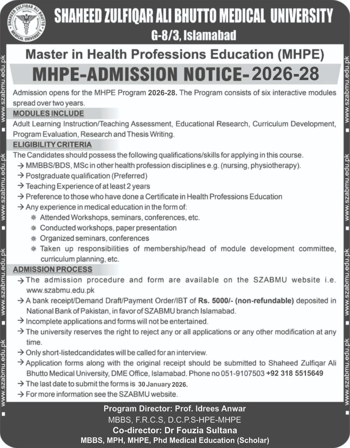 Admission Notice - Master of Health Professions Education (MHPE) 2026-28