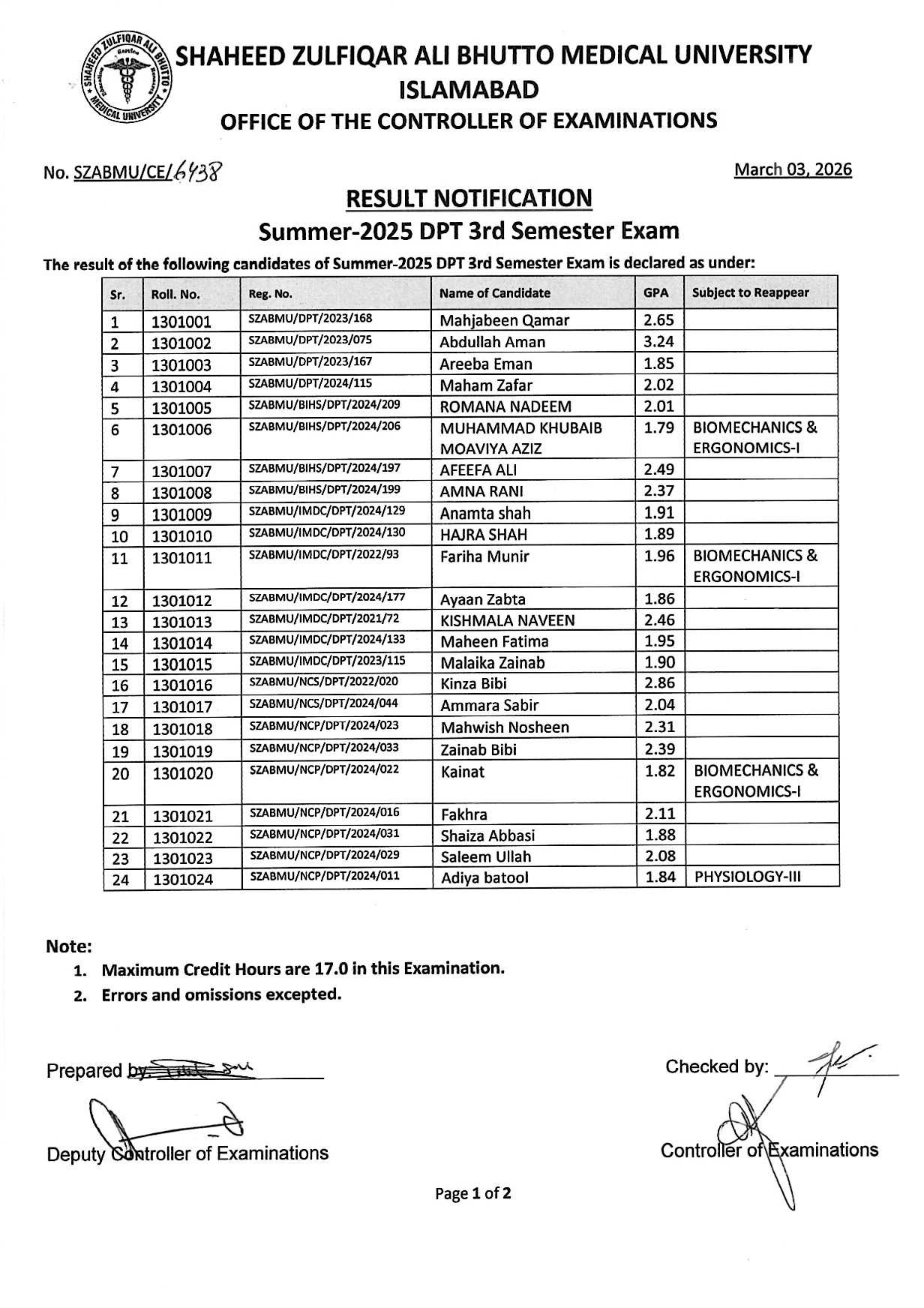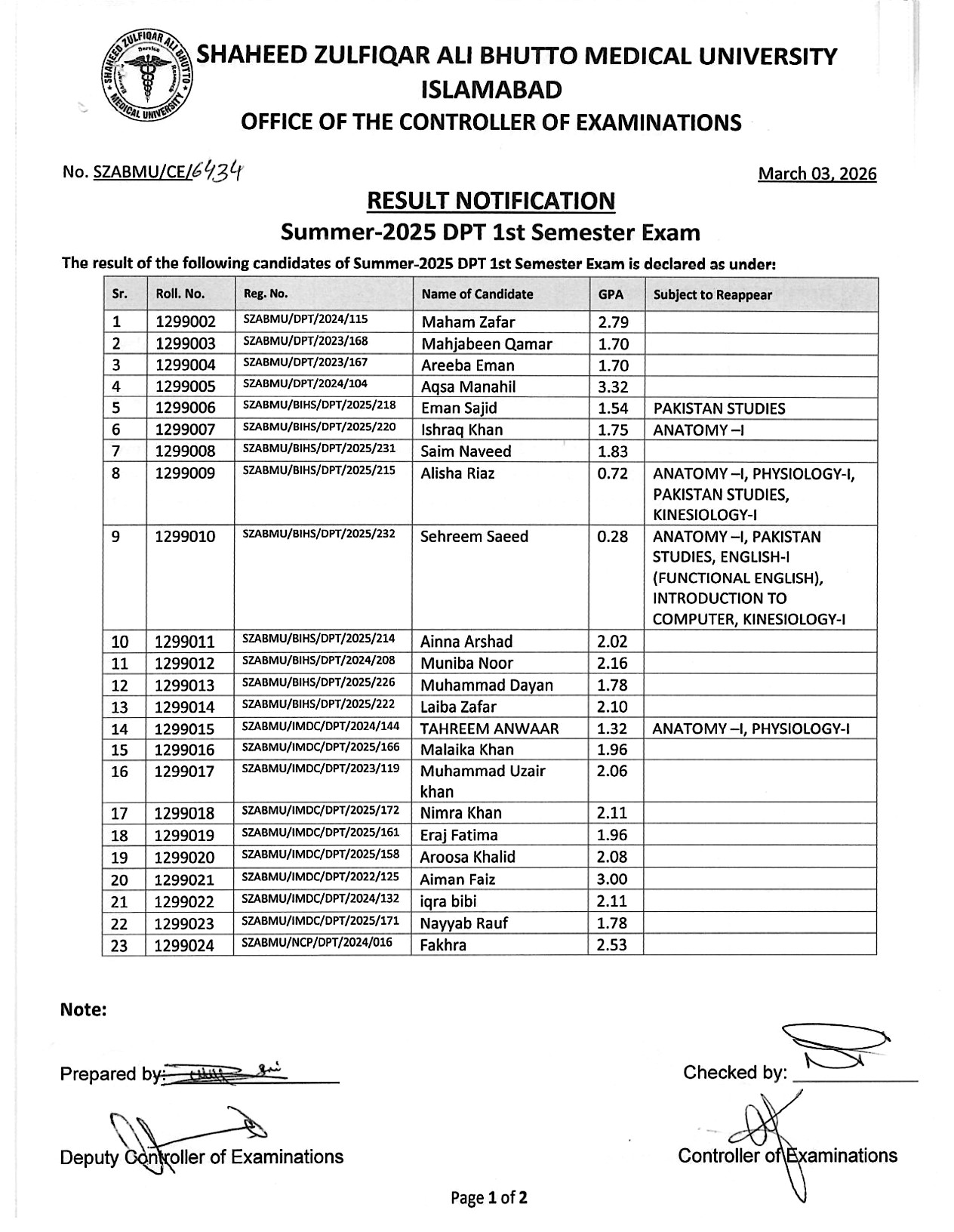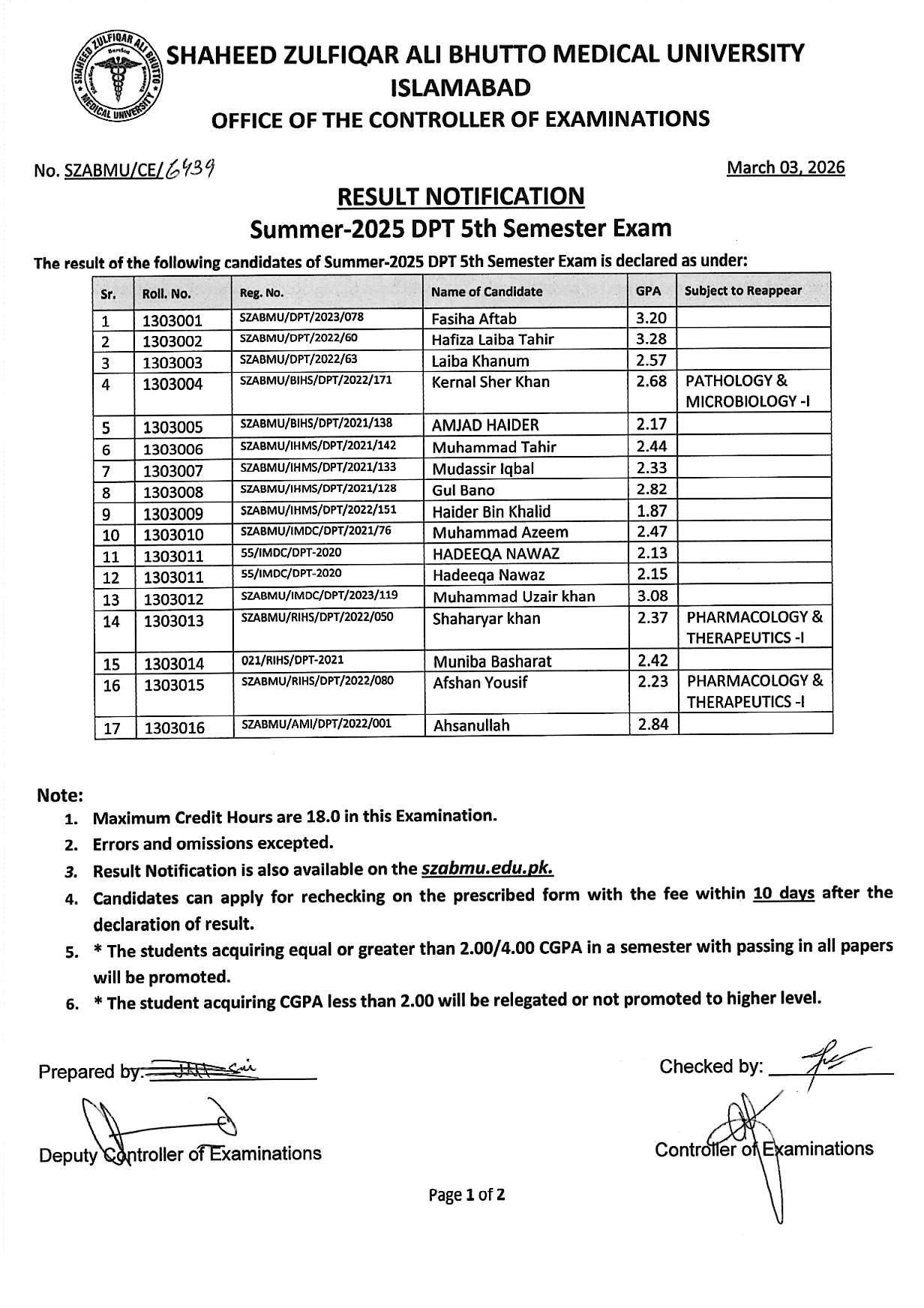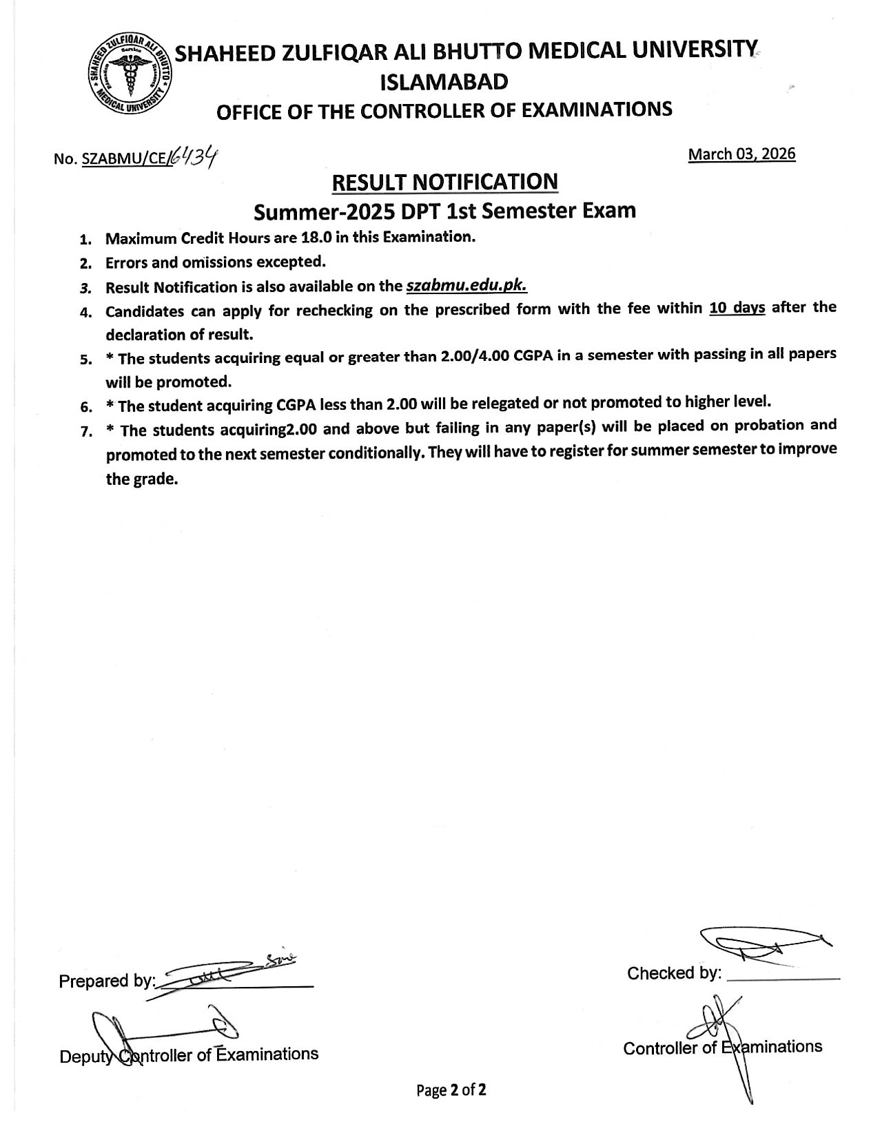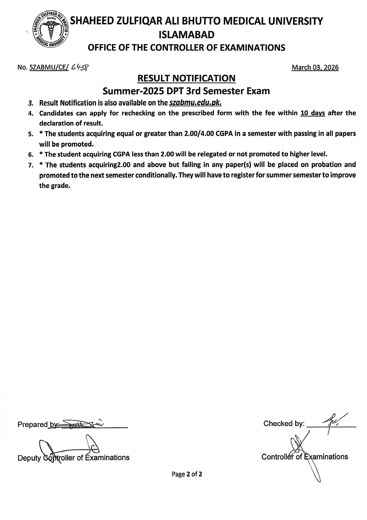 Result Notification - Summer 2025 DPT Semester Exam