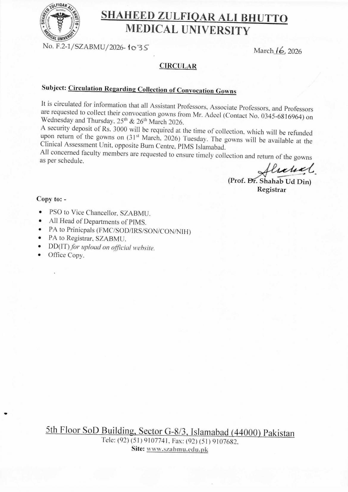 Circulation Regarding Collection of Convocation 2026 Gowns for Faculty Members