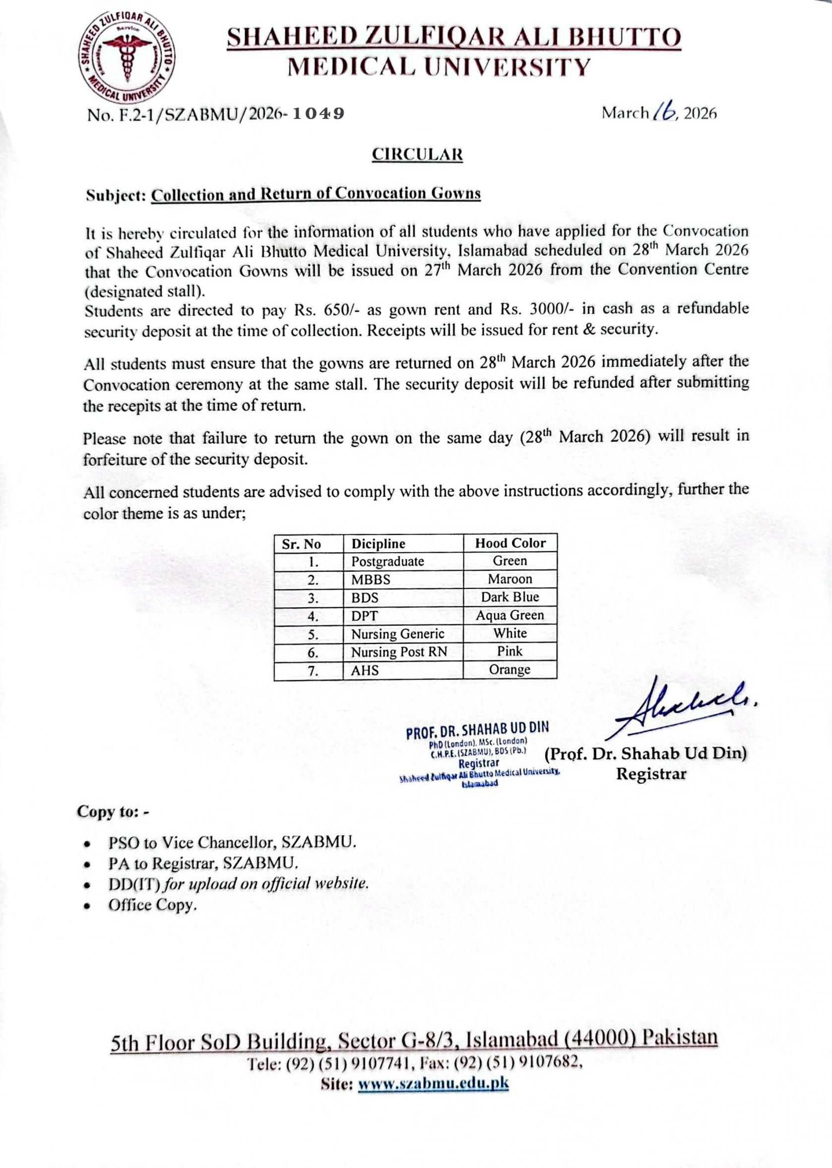 Circular - Collection and Return of Convocation 2026 Gowns for Postgraduate and Graduate Students