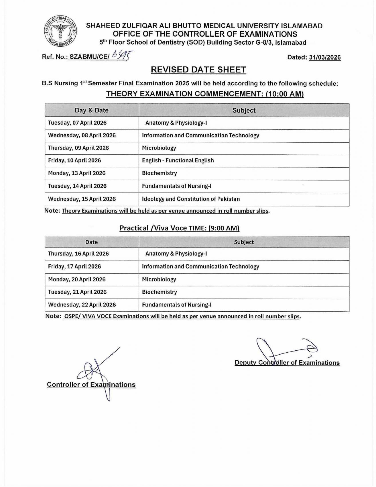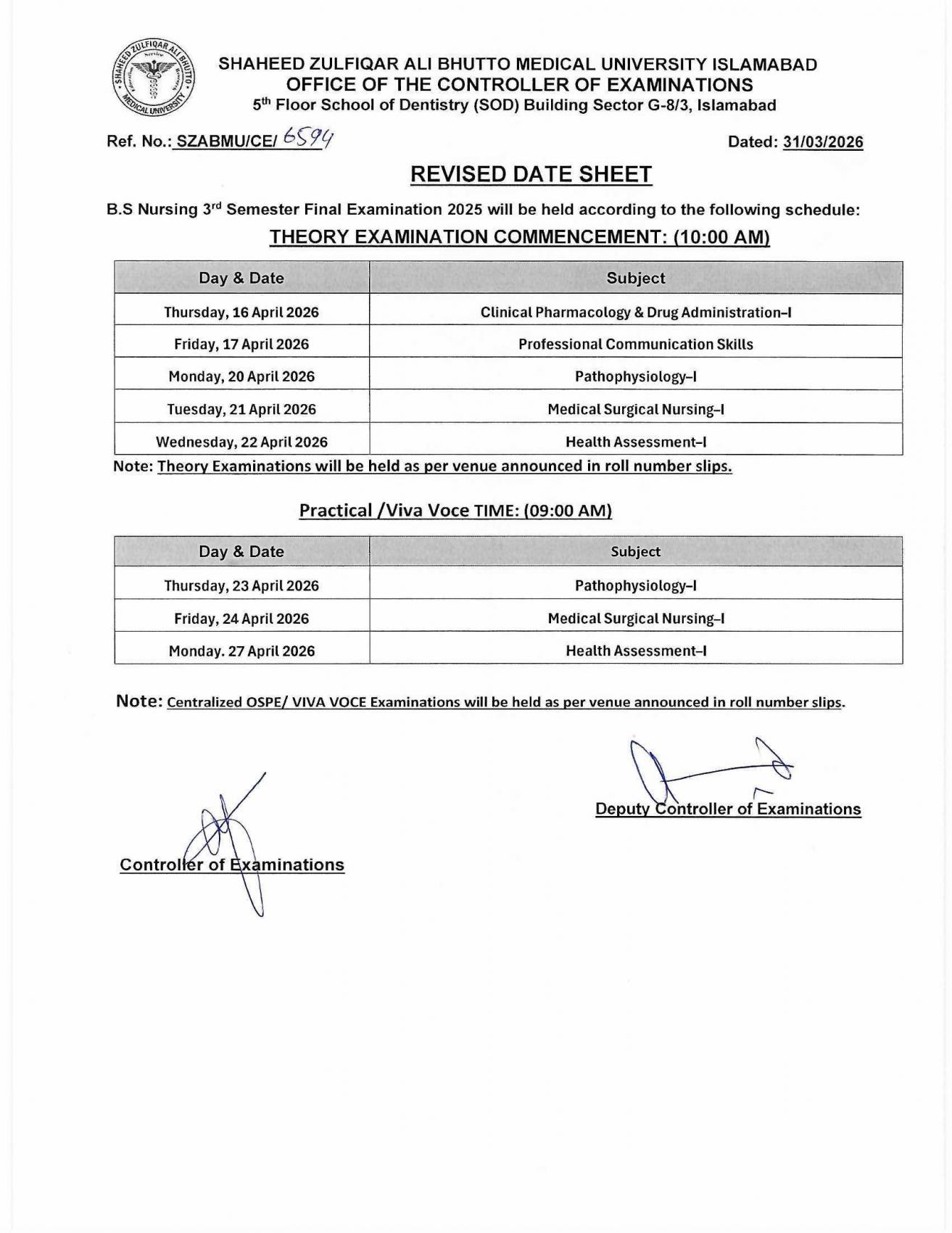 Revised date sheet - BS Nursing 1st and 3rd Semester Final Exam 2025