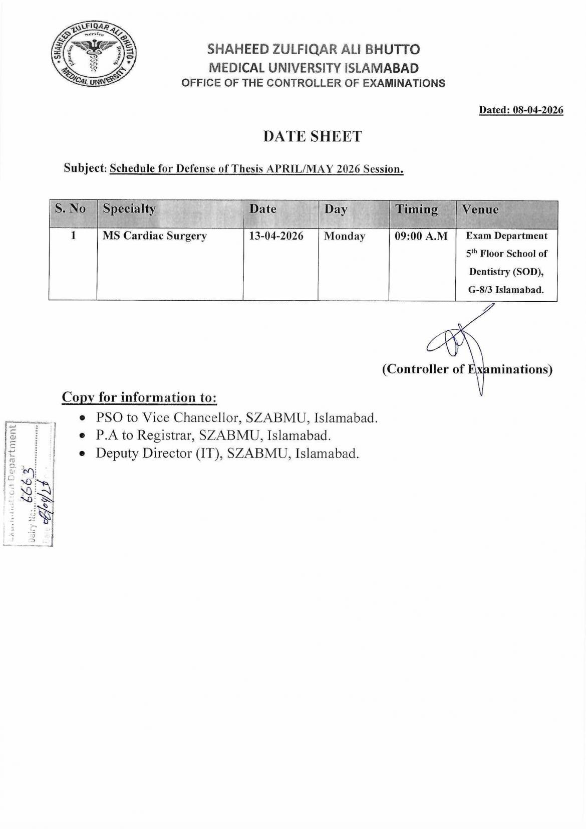 Schedule for Defense of Thesis Examinations April/May 2026 Session
